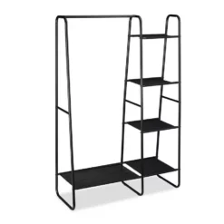Praktische Garderobe für den Haushalt Dieser Garderobenständer ist im Flur, im Zimmer oder im Waschraum ideal für Ihre Bedürfnisse. Die Garderobe im Flur bietet Platz für Jacken, Taschen, Hüte und Schuhe, im Zimmer ist die stilvolle Präsentation der Kleidung im offenen Kleiderschrank möglich und im Waschraum lässt sich Wäsche trocknen oder zwischenlagern. All diese Nutzungsmöglichkeiten sind bei diesem Kleiderständer möglich – dank dem Platz, den 5 Ablagen und die Kleiderstange bieten. Das schlichte Design passt sich jedem Stil an.