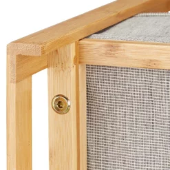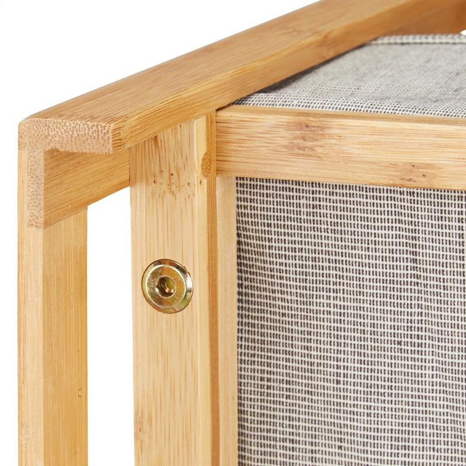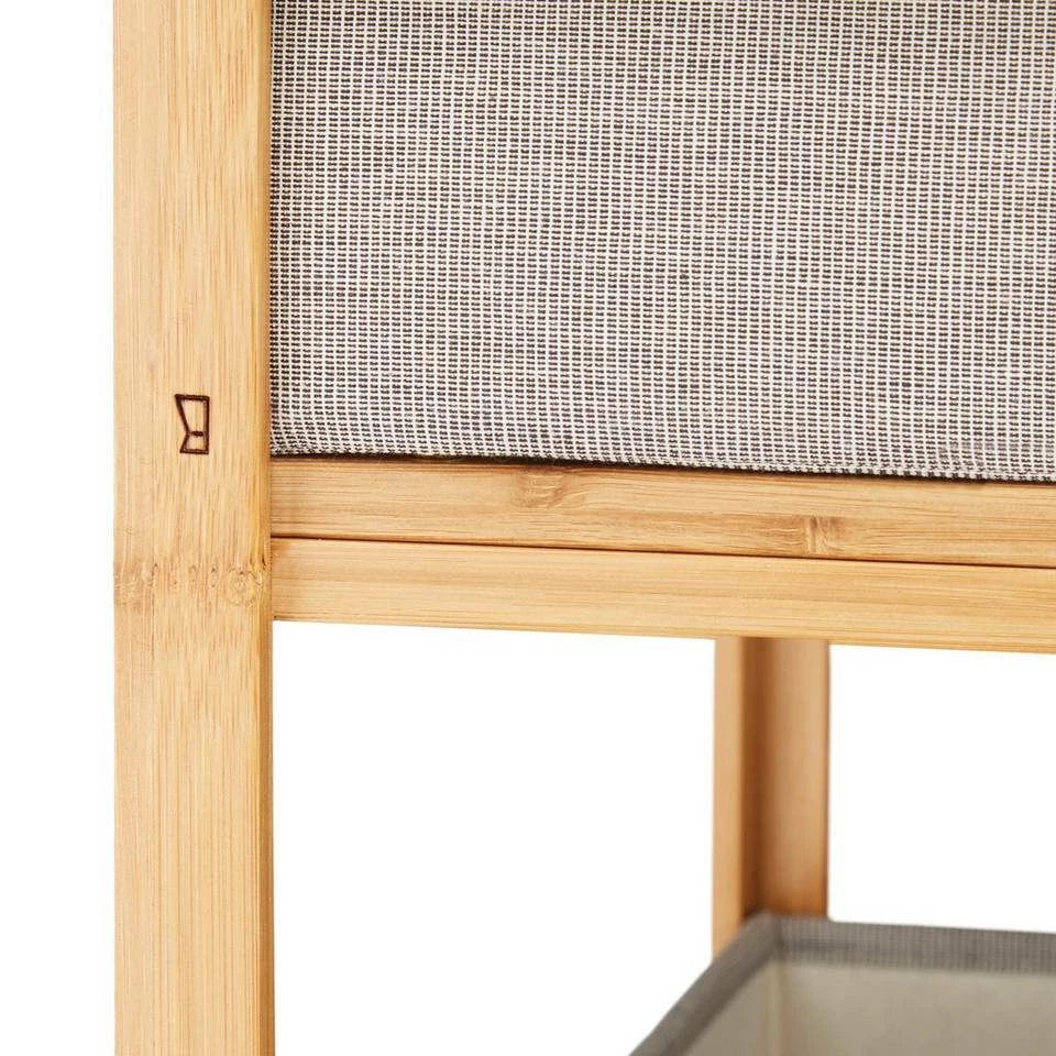 - Angenehme Optik: Das Regal ist aus natürlich schön gemasertem Bambusholz hergestellt – Der Stoff besteht aus Polyester und Baumwolle – Weißes Gittergeflecht auf schwarzem Grund