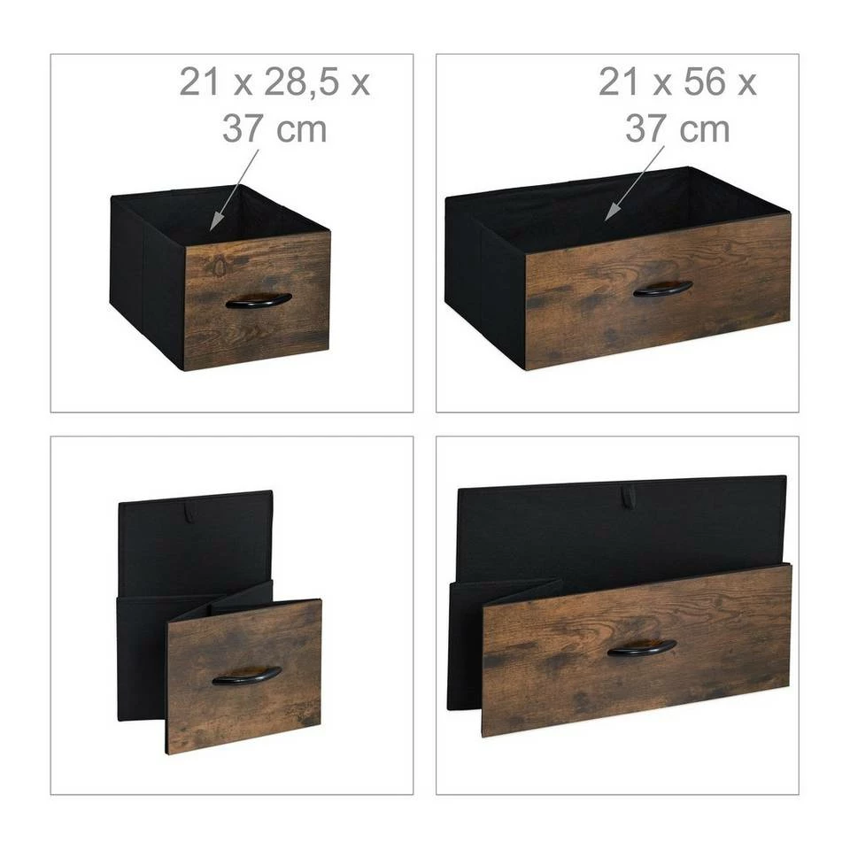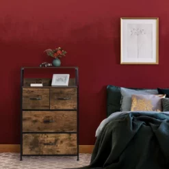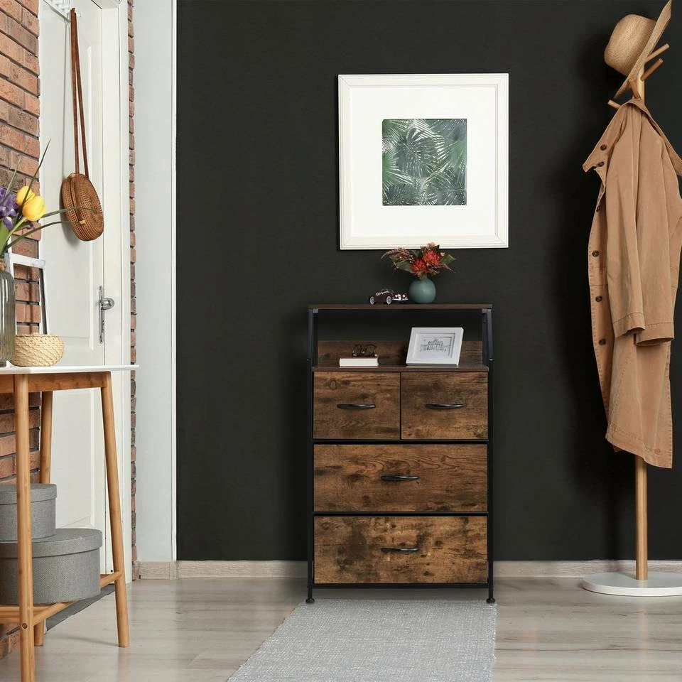 Stylische Hochkommode im Industrial-Design Dieser Kommodenschrank passt dank seines schmalen Design hervorragend in kleine Flure, macht aber auch im Wohn- oder Schlafzimmer eine gute Figur. In den 4 Schubladen bietet die Stoffkommode viel Stauraum für Kleidung, Schals, Bücher & weitere Gegenstände. Auf den 2 offenen Ablagen lassen sich Pflanzen, Blumenvasen oder Bilder dekorativ präsentieren. Der Materialmix aus schwarzem Metall & MDF in Holzoptik kreieren einen tollen Industrial Style, der den Schubladenschrank zu einem echten Blickfang macht.