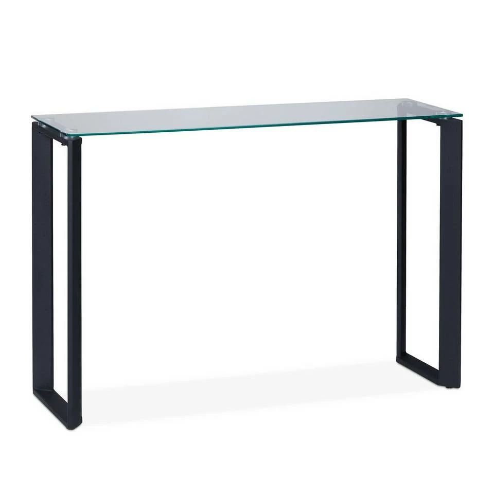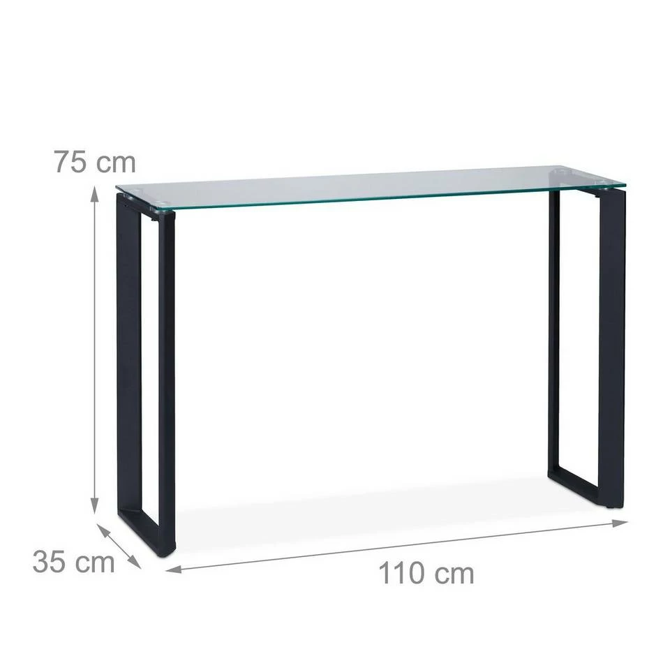 Eleganter Eingangstisch aus Glas & Metall Dieser schmale Beistelltisch macht bereits im Eingangsbereich eine gute Figur. Das stabile Metallgestell in Schwarz trägt die transparente Glasplatte mit einer gewissen Leichtigkeit. Somit sorgt der Glastisch auch im Schlafzimmer oder Wohnbereich für eleganten Charme. Auf der gläsernen Ablagefläche der Flur Konsole finden neben nützlichen Dingen wie Briefen, Zeitschriften oder dem Telefon auch Dekoartikel, Pflanzen oder Fotos einen Platz.