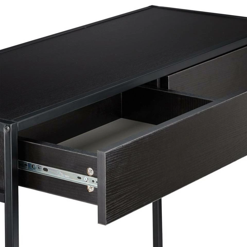 Ablagetisch mit Schubladen Schaffen Sie mit der Tischkonsole auch auf kleiner Fläche Raum zur Aufbewahrung. Ideal ist der Konsolentisch im Flur zur Ablage von Telefon, Schlüssel und mehr, aber auch im Wohn- oder Schlafzimmer ist der Tisch praktisch als Ablage für Deko, Bilderrahmen, Bücher o. Ä. In den Schubladen finden kleinere Gegenstände Platz. Der moderne Materialmix des Korpus in Holzoptik und des Metallgestells in Schwarz macht den Flurtisch zu einem edlen Hingucker.