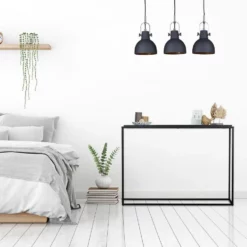 - Materialkombi: Flurtisch mit schwarzem Metallgestell und Ablage in Holzoptik – Modernes Design
