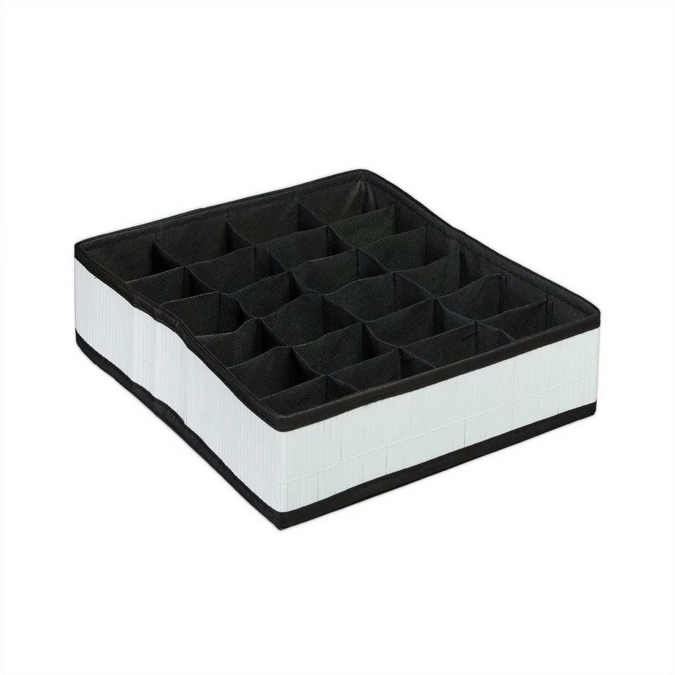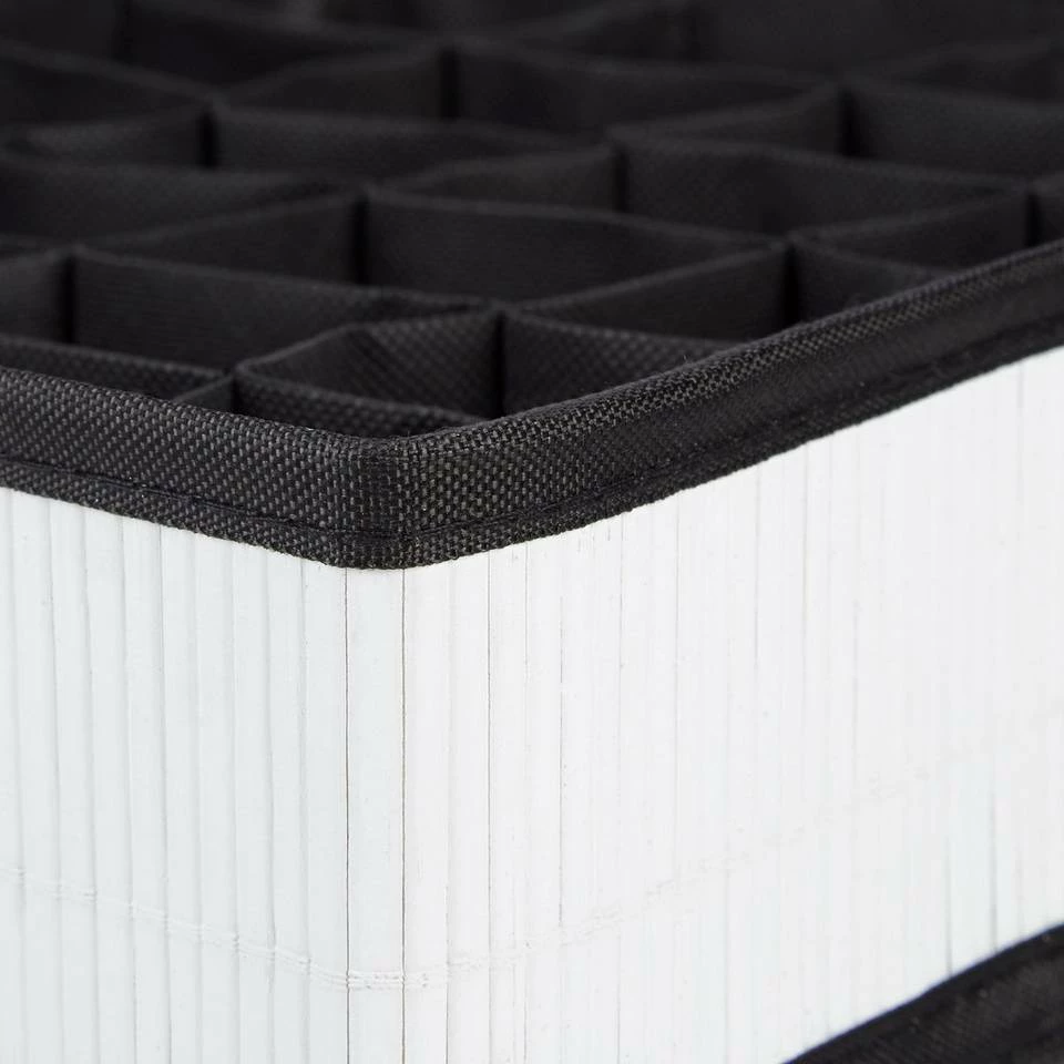 Krawattenbox im natürlichen Design als Schubladenorganizer Nicht selten kommt es vor, dass man zu Hause eine Schublade besitzt, in der das blanke Chaos herrscht. Mit einem Schubladenorganizer können Sie kleine Kleidungsstücke wie Schals, Socken, Krawatten gut sortiert und ohne viel Mühe unterbringen und diesem Chaos entgegenwirken. 24 Zellen stehen in dem Schubladenorganizer im natürlichen Bambus-Look zur Verfügung. Bringen Sie hier auch Schmuck, Schminke und viele andere Sachen unter. Für Geschäftsreisen ist die Schubladenunterteilung besonders praktisch und kann dort als Krawattenbox dienen. Dank eines Reißverschluss-Systems ist die Box in Sekundenschnelle zusammengelegt und in der Reisetasche verstaut.