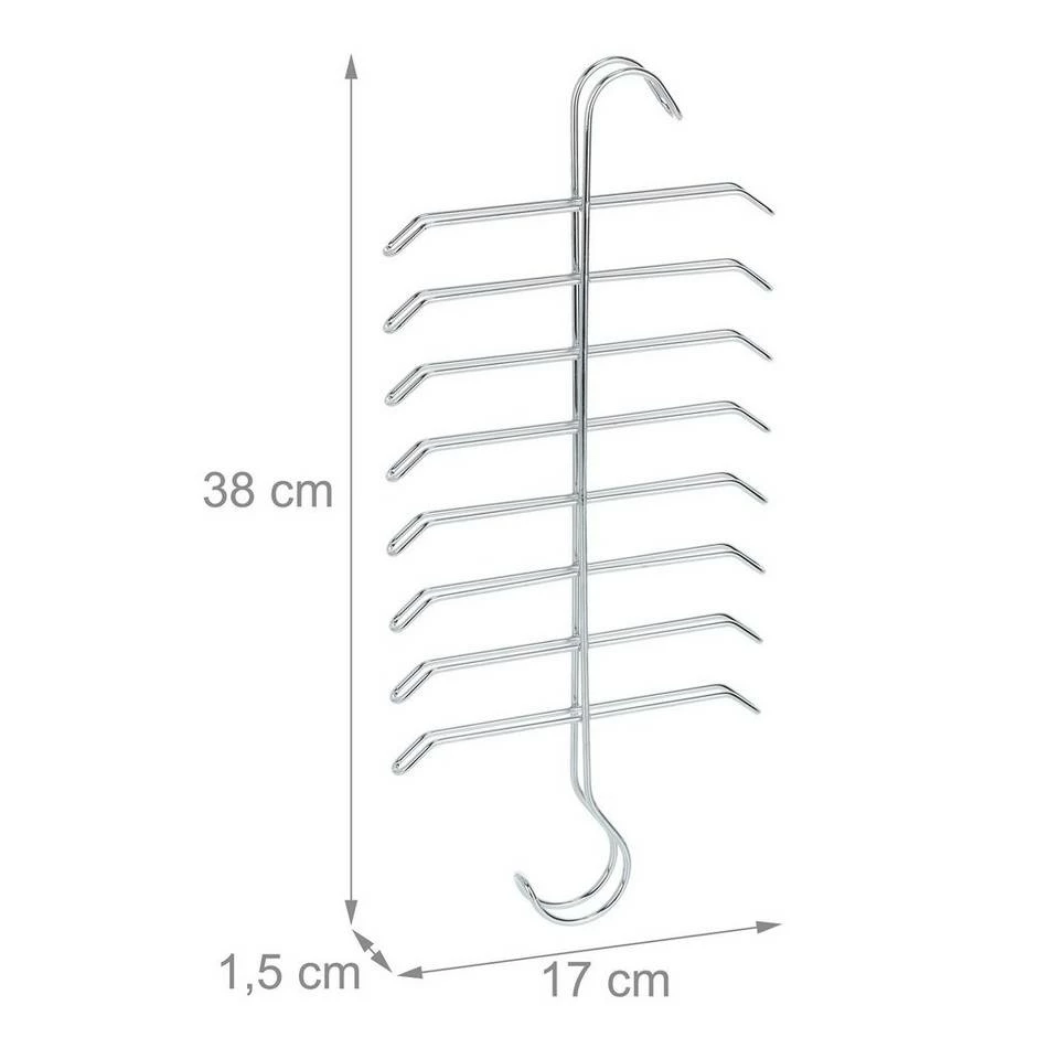 Krawattenbügel in modernem Design Oft kann es morgens doch einmal stressig werden, und dann muss die richtige Krawatte schnell gefunden sein. Bringen Sie deshalb Ordnung in Ihren Kleiderschrank mit diesem platzsparenden und modernen Krawattenhalter aus Metall. Er ermöglicht Ihnen nicht nur ein übersichtliches, sondern auch knitterfreies Aufhängen Ihrer Schlips-Sammlung. Ihre Lieblingskrawatte zerknittert so künftig nicht mehr achtlos im Schrank, sondern ist jederzeit tragebereit. Auch Gürtel und Tücher finden an den 16 Haken des Krawattenhängers Platz.
