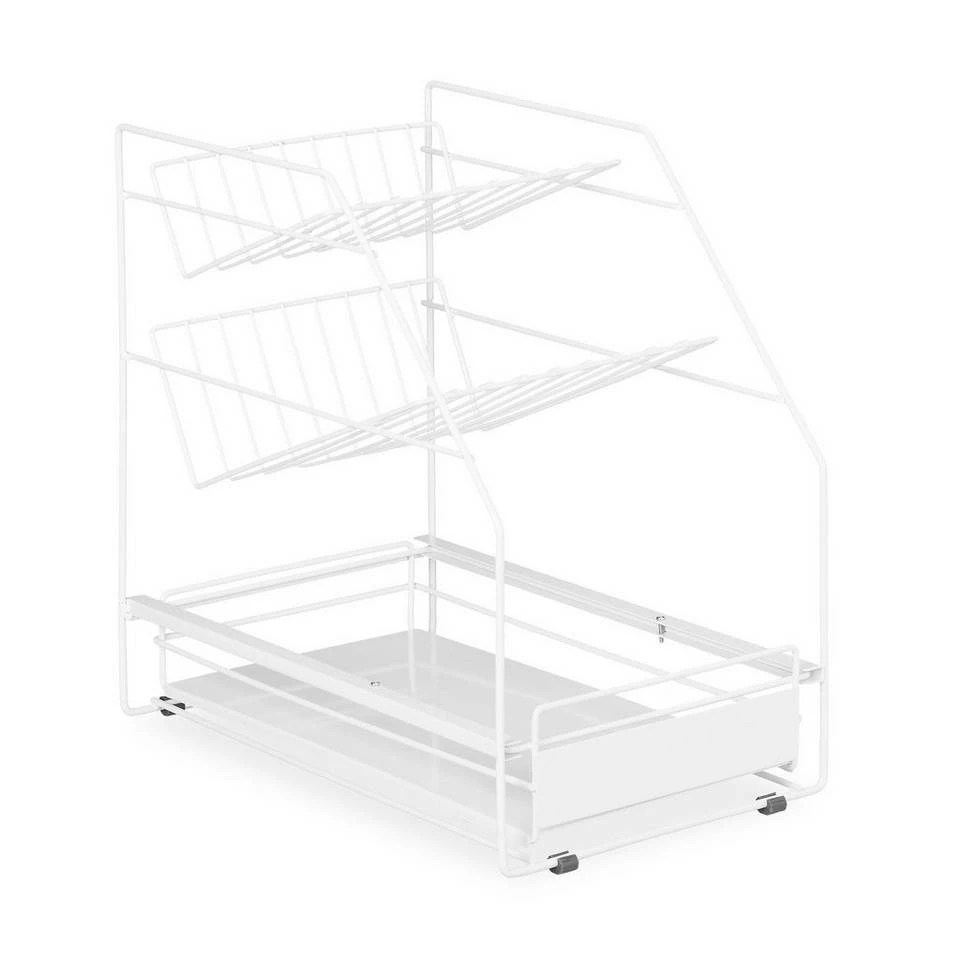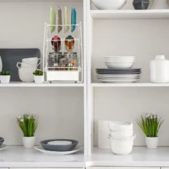 Stabiles Etagenregal für mehr Stauraum Mit diesem Küchenregal haben Sie Lebensmittel wie Konserven, Öl, Essig, Nudeln und vieles mehr platzsparend und übersichtlich verstaut. Das Schubfach des Küchen Organizers kann auch zur Aufbewahrung von Gewürzen genutzt werden und die obere Ablage bietet Platz für Abendbrotteller. Das Küchen Aufsatzregal aus weißem Metall ist freistehend und kann nach Belieben im Küchenschrank oder auch auf der Arbeitsplatte platziert werden.