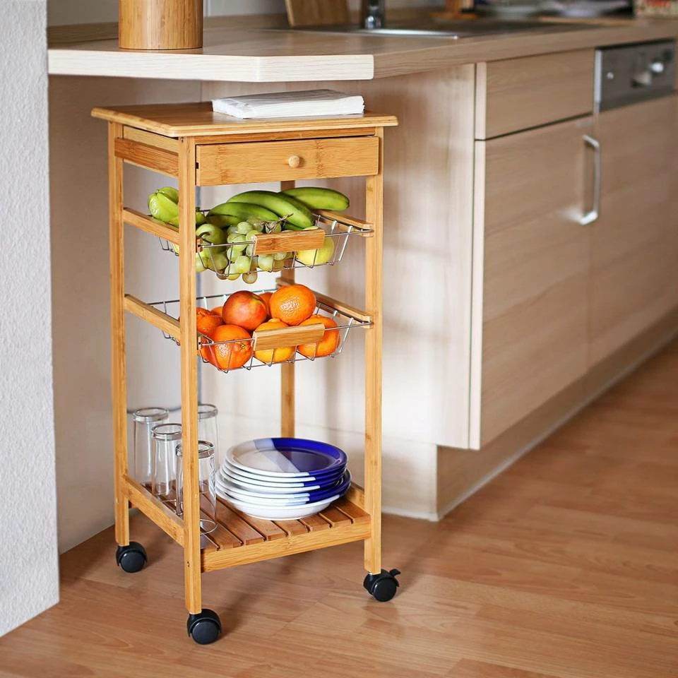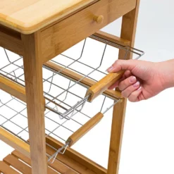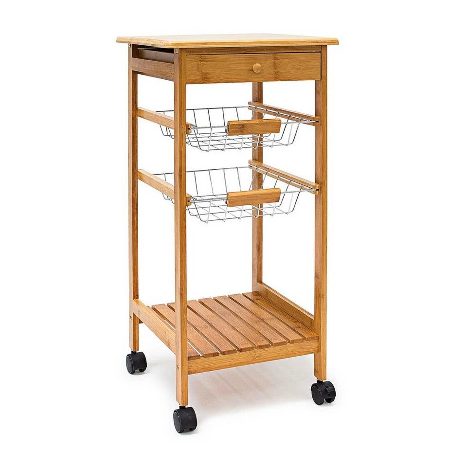 Kleiner Küchenwagen aus Bambus Schaffen Sie sich mobilen Stauraum für Ihre Küche. Mit den Servierwagen der JAMES Reihe können Sie ohne Probleme Geschirr, Gläser, Obst und vieles mehr transportieren und schnell an den Essenstisch oder das Bett fahren. Der hochwertig verarbeitete Bambus verströmt dabei ein rustikales Flair und fügt sich freundlich und warm in Ihre Einrichtung. Der Küchenrollwagen der Größe S ist der kleinste der Serie und überzeugt mit seiner geringen Stellfläche. Er verfügt über 2 Körbe aus Metallgitter, die Sie einfach entnehmen und auch separat benutzen können.