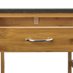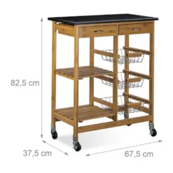 Großer Küchenwagen der ALFRED Reihe Der Küchenwagen ist der größte Vertreter der ALFRED Serie. Zum Blickfang wird er durch die eindrucksvolle Arbeitsplatte aus schwarzem Marmor. Das Gestein wirkt im Zusammenspiel mit dem natürlichen Bambus sehr edel und stilvoll. Verstauen Sie in den vielen Ablagemöglichkeiten Speisen, Lebensmittel, Geschirr uvm. Schnell und bequem haben Sie alles für das Festessen am gewünschten Platz. Dank der komplett schwenkbaren Rollen rangieren Sie mit dem Servierwagen auch auf engem Raum mühelos.
