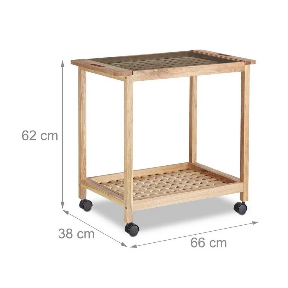 Küchenwagen auf Rollen für Überblick in der Küche Schaffen Sie zusätzlichen Stauraum in Ihrer Küche mit dem klassisch schönen Küchenwagen auf Rollen. Der mobile Servierwagen ist aus edlem Walnussholz und kann mit oder ohne Glasplatte genutzt werden. Die 4 leisen Räder aus Kunststoff drehen sich um 360 Grad. So manövrieren Sie den Rollwagen ganz einfach. Um Türschwellen zu überwinden, heben Sie den Küchentrolley an den 2 seitlichen Griffen an. Die offenen Seiten erlauben schnellen Zugriff. Nutzen Sie den Allzweckwagen für Lebensmittel in der Küche, für Putzmittel im Bad oder für Blumen im Wintergarten.