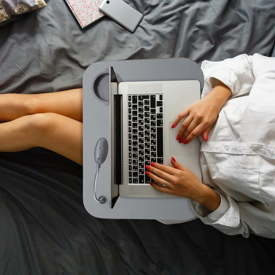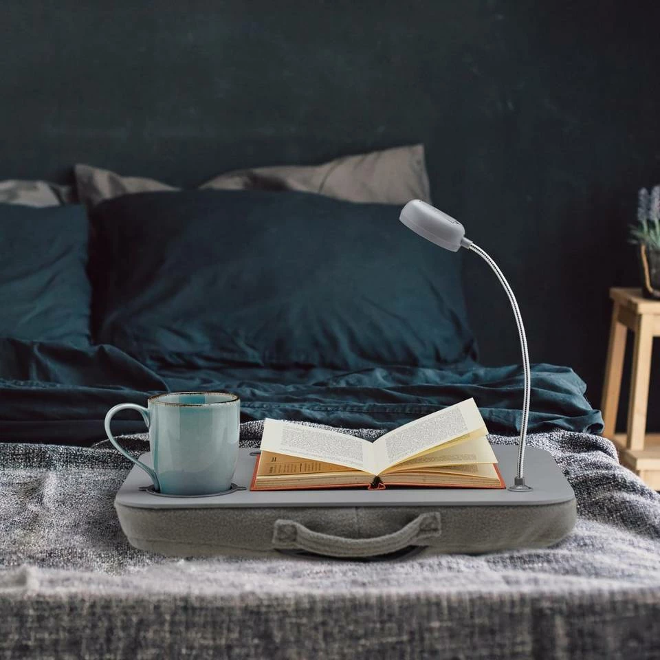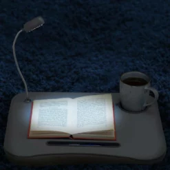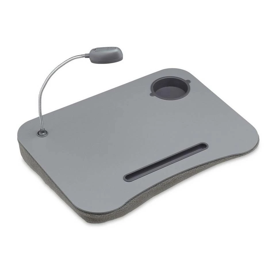 Laptopkissen mit Licht und Getränkehalter Nehmen Sie Ihr Notebook einfach auf den Schoß. Das ist sehr komfortabel für Sie und gibt Ihrem Notebook gleichzeitig festen Halt – egal ob als Notebooktisch, oder mobiler Arbeitsplatz – überall bequem arbeiten! Der Lapdeask mit feinen Mikroperlen überzeugt durch eine anatomische Form der Arbeitsfläche und sorgt mit seiner cleveren Bauweise dafür, dass dass der Laptop immer genug Luft bekommt. Das praktische Laptopkissen verfügt dazu über eine energiesparende LED-Leuchte und ein zusätzliches Fach für Becher, Tasse, Stifte oder andere Büroartikel.