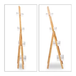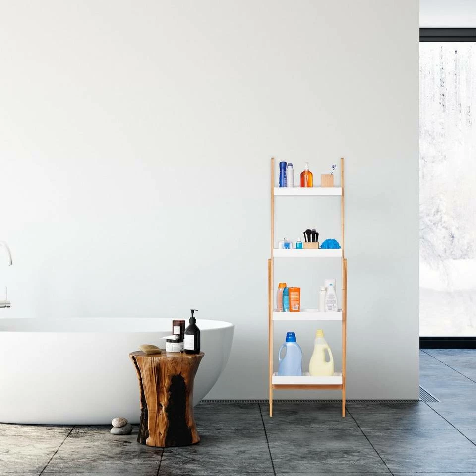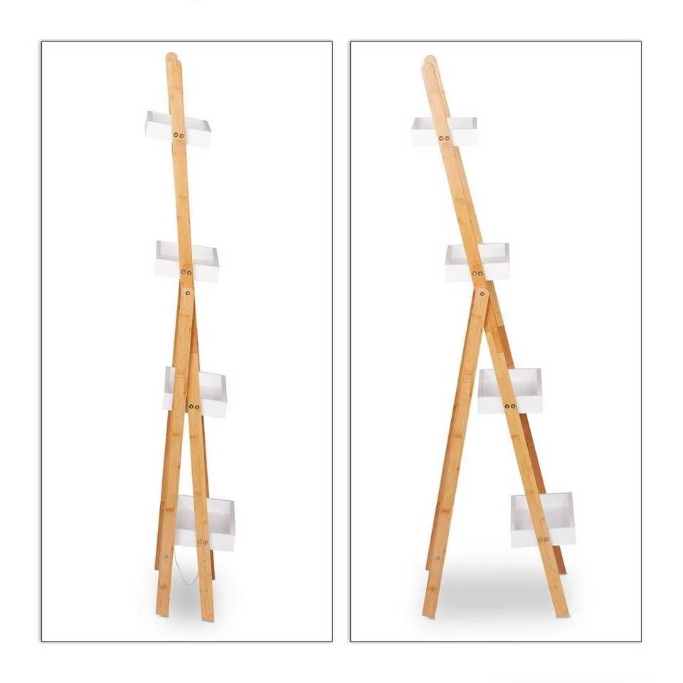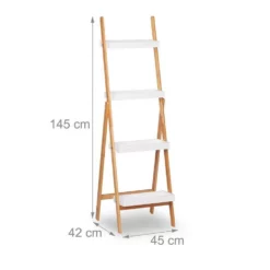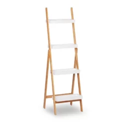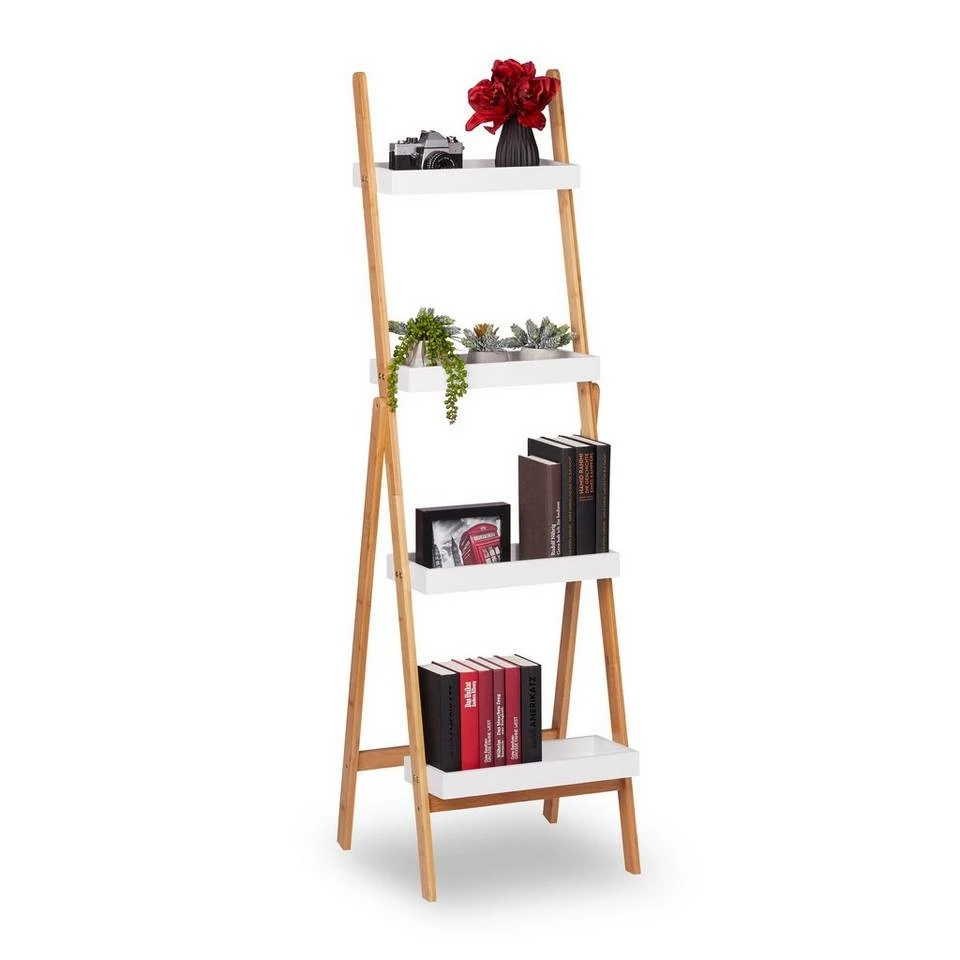 Schlichte Regalleiter für Deko und Aufbewahrung Stilvolle Lösungen für die Aufbewahrung von Kleinigkeiten sind oft schwierig zu finden. Doch dieses Leiterregal ist die ideale Lösung für kleine Räume und Ecken, in denen Sie dekorativ Ihre Habseligkeiten lagern möchten. Das moderne Design mit Bambus und weißem MDF passt sich jeder Einrichtung an und passt sowohl in Badezimmer, als auch in den Wohnbereich. In 4 Fächern haben Sie die Möglichkeit, Pflanzen, Bücher und Dekorationsgegenstände unterzubringen – ein Blickfang für Ihr Zuhause.