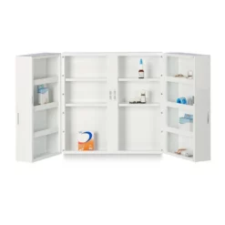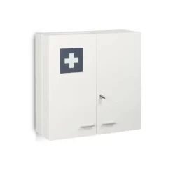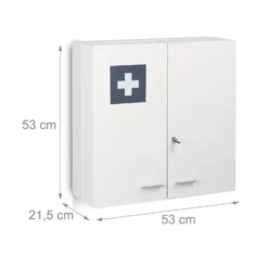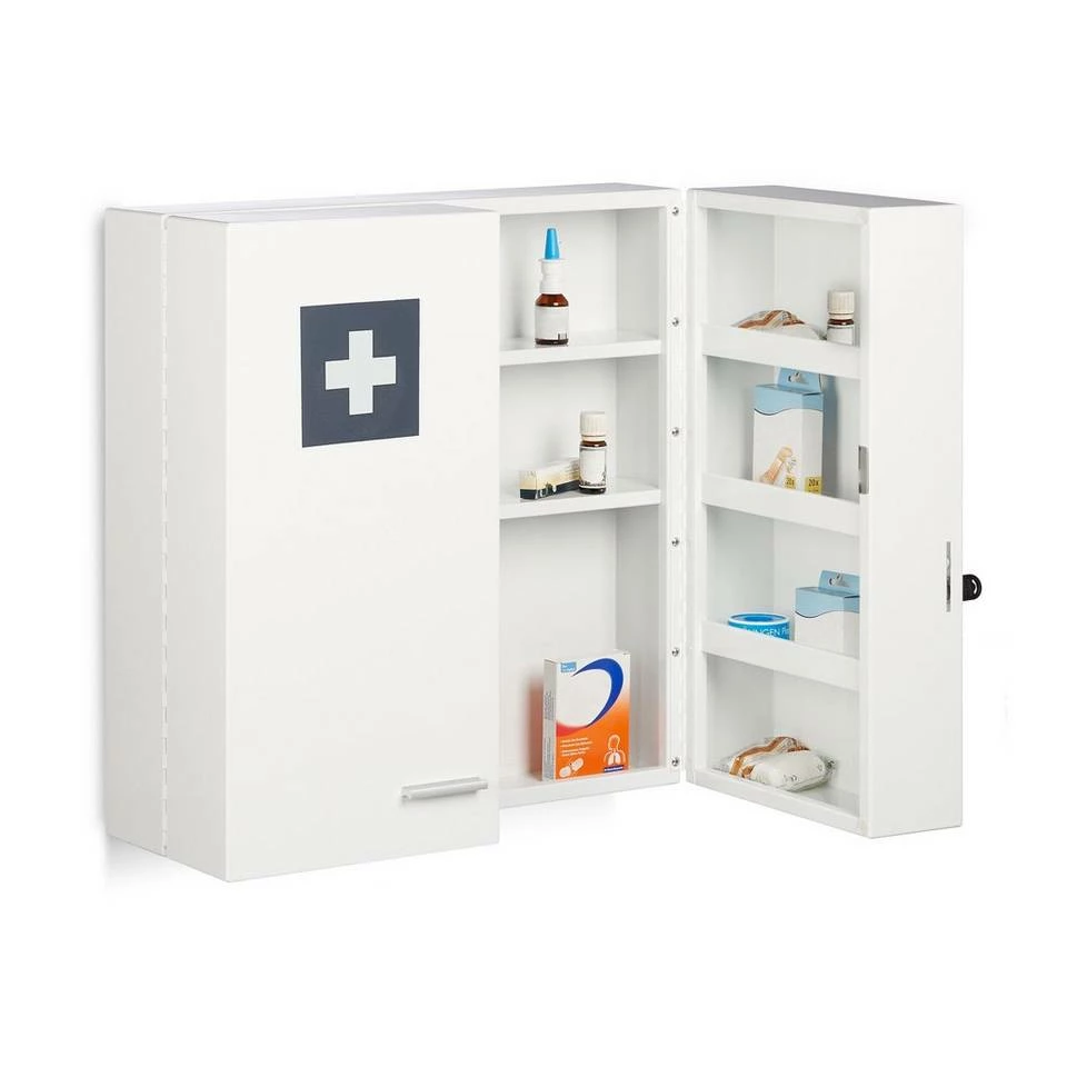 XXL Arzneimittelschrank zum Aufhängen Dieser große Medizinschrank bietet viel Stauraum für Deine Hausapotheke. Bewahre in den 11 Fächern Fläschchen, Tabletten uvm. ordentlich auf und habe bei Krankheit oder im Notfall die richtige Arznei griffbereit. Die Flügeltüren des Apothekerschranks schließen mit Magnetkontakt und lassen sich um 180° öffnen. Dank der Abschließbarkeit sind die Medikamente im Arzneischrank vor Kindern geschützt. Der funktionale Sanitätsschrank aus Stahl ist schnell aufgehängt und passt in nahezu jedes Badezimmer.
