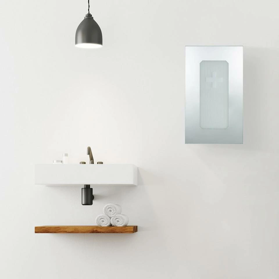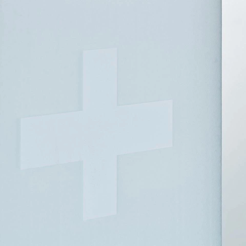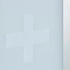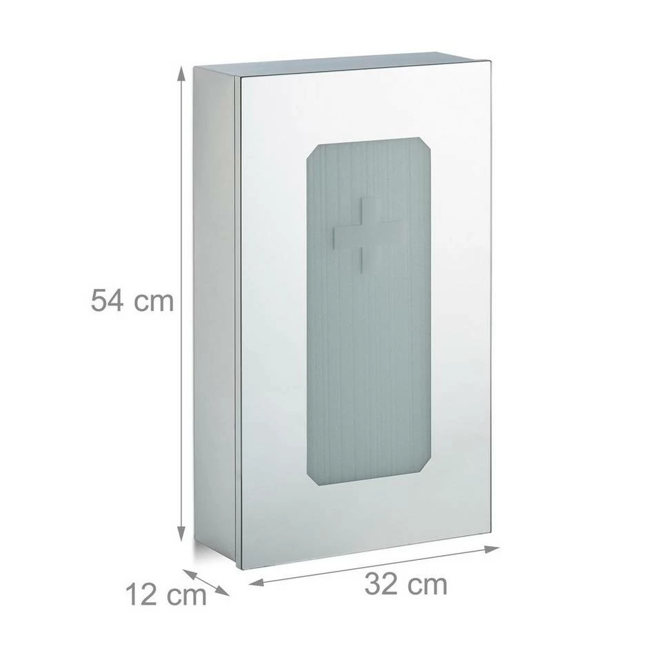 - Mit Glastür: Die Schranktür kann im Notfall als Spiegel genutzt werden – Mit Erste-Hilfe-Kreuz