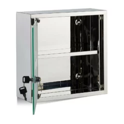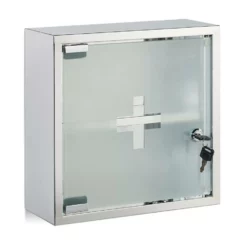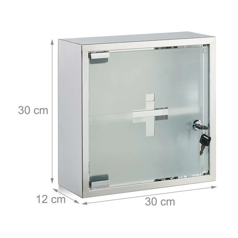 Arzneischrank mit 2 Fächern Wenn wichtige oder für Kinder gefährliche Medikamente sicher aufbewahrt werden sollen, ist der abschließbare Medizinschrank eine gute Wahl. Ihnen stehen 2 Fächer zur Verfügung, in denen auch Verbandszeug oder Erste-Hilfe-Sets Platz finden. Die Tür aus mattiertem Glas ist mit einem Erste-Hilfe-Kreuz versehen. Das quadratische Gehäuse aus glänzendem Edelstahl fügt sich bestens ein, wo immer Sie den Medikamentenschrank hinhängen – das erforderliche Montagematerial ist in der Lieferung enthalten.