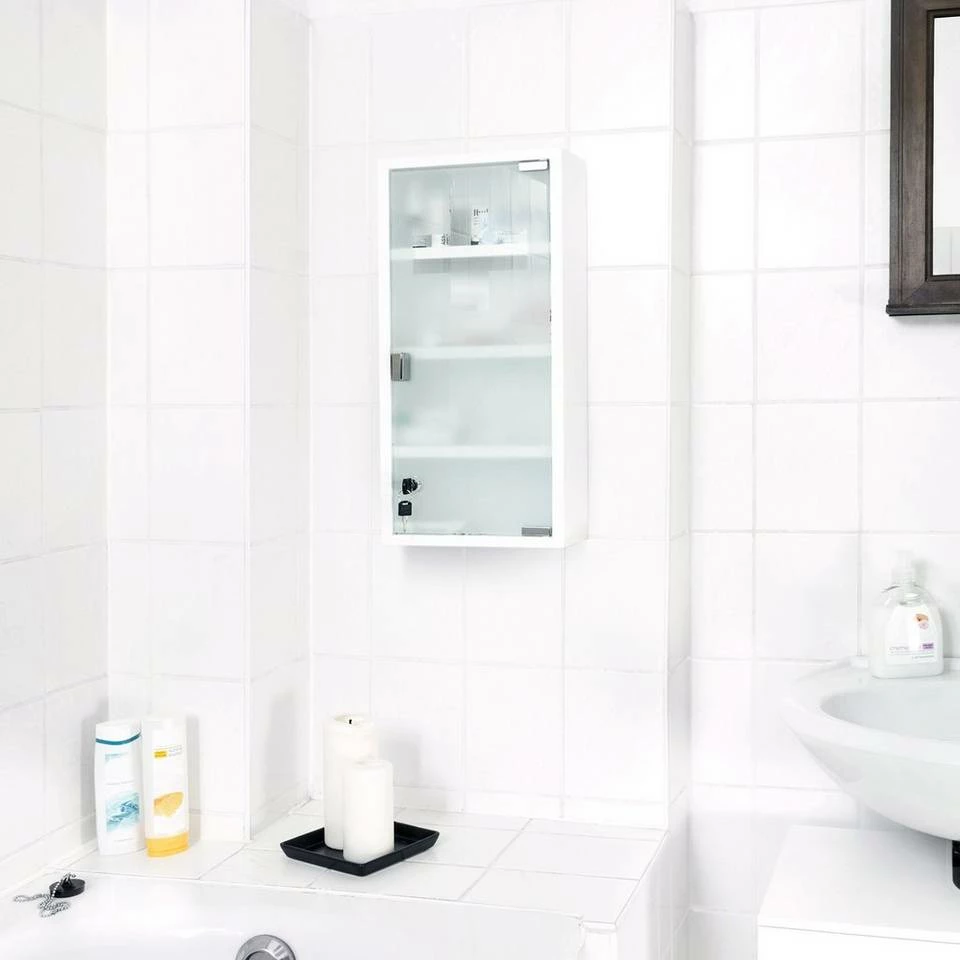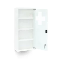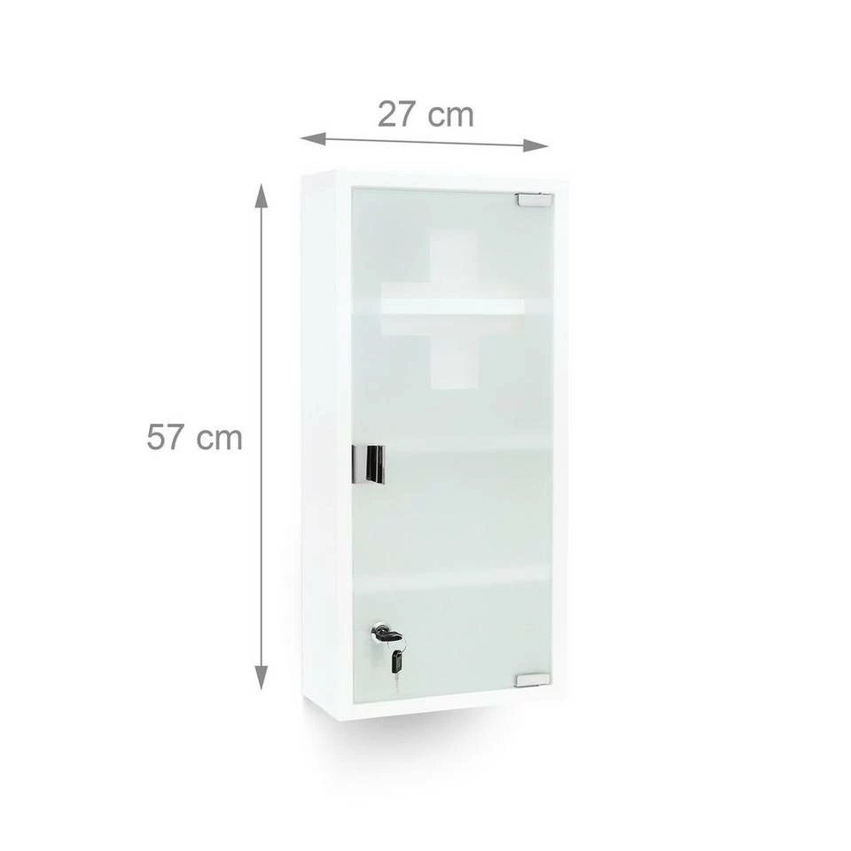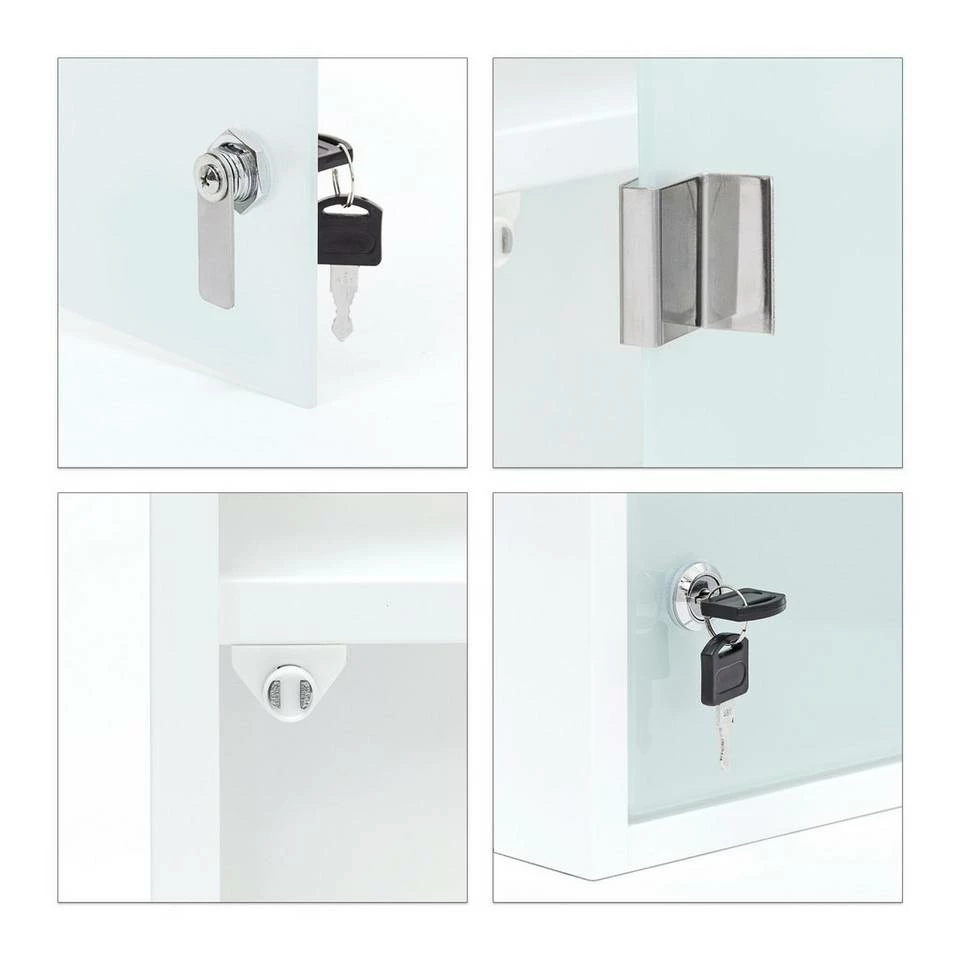Großer Arzneischrank zum Abschließen Die Medizinschränke der EMERGENCY Kollektion überzeugen durch ihre robuste Bauweise und den modernen, klaren Stil. Ihre magnetische Tür aus satiniertem Glas wird mit dem eingelassenen Kreuz aus Klarglas zum echtem Hingucker im Badezimmer. Das weiße Metall wirkt freundlich und fügt sich dezent in jede Einrichtung. Der Erste-Hilfe-Schrank in XXL Größe verfügt über 4 geräumige Ablagen. Diese bieten viel Stauraum für Ihre Medikamente, Verbände und Hausapotheke. Dank der mitgelieferten Schlüssel können Sie diesen Inhalt ohne Probleme vor Kindern geschützt aufbewahren.
