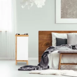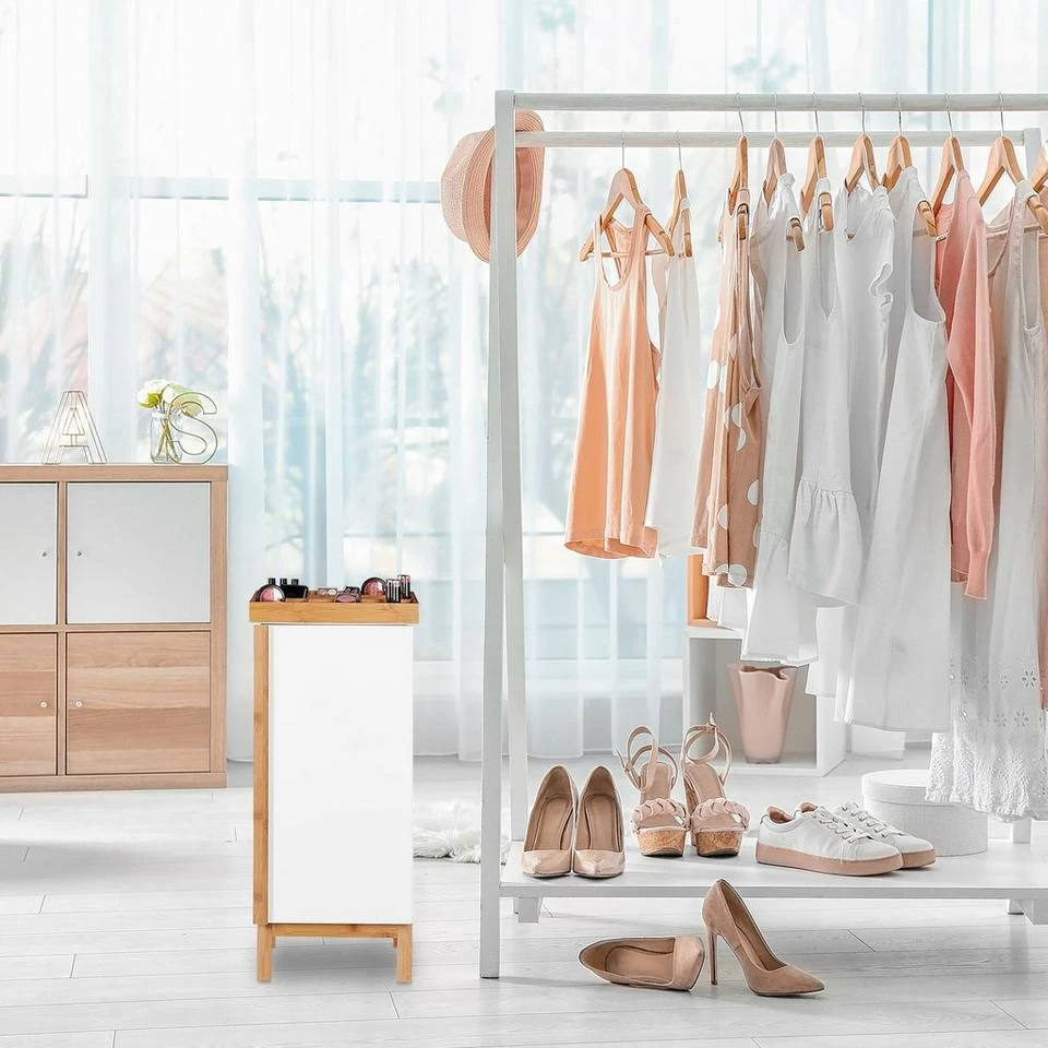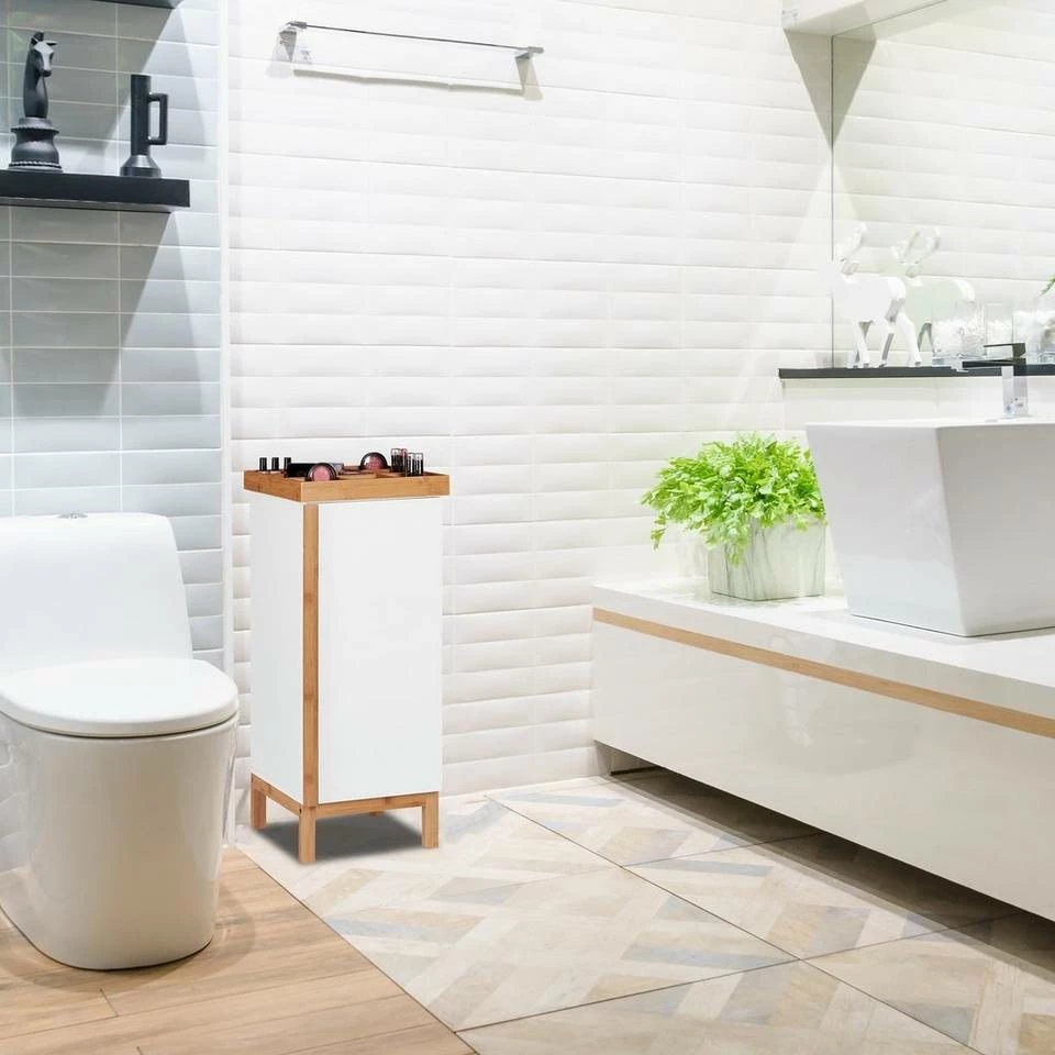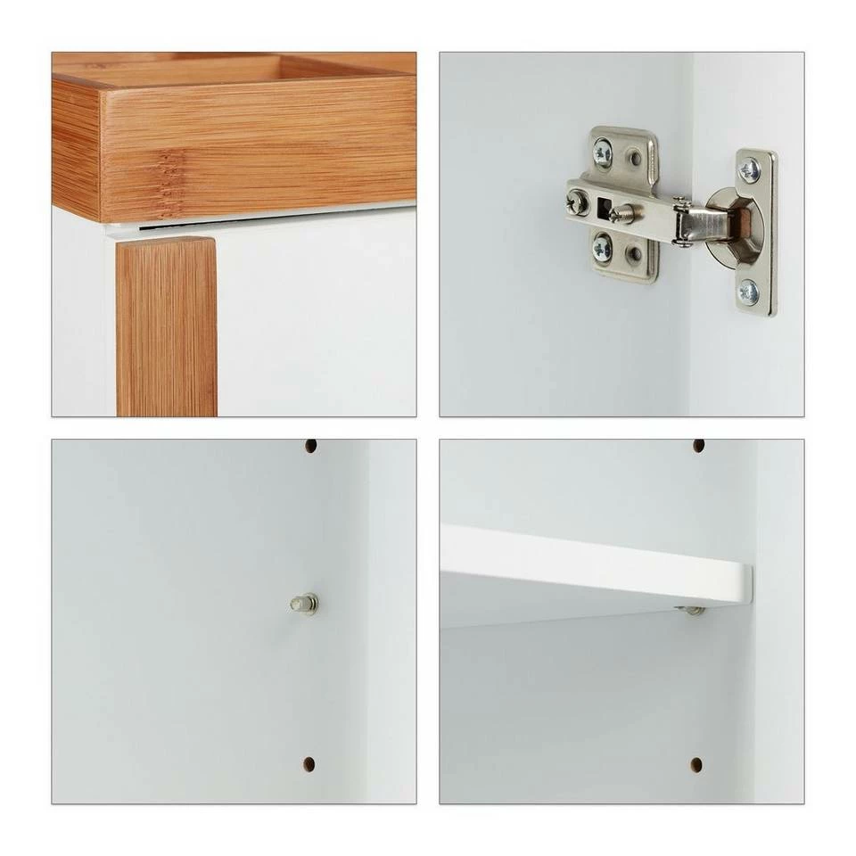 - Ordnung: Der niedrige Schrank bewahrt Ordnung im Bade- oder Schlafzimmer – Tür mit Bambus-Griff