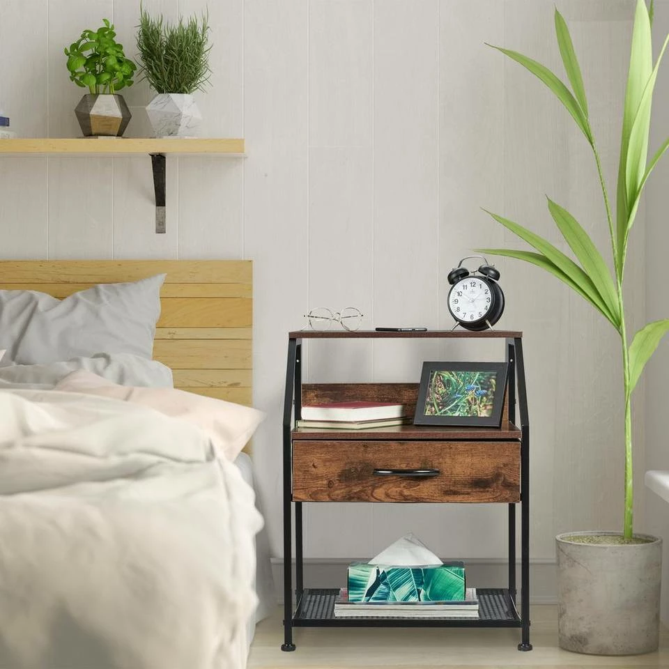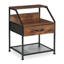 Rustikaler Beistelltisch für das Schlafzimmer Diese kleine Nachtkommode ist die ideale Ergänzung neben Ihrem Bett. Der Nachtschrank schafft nicht nur wertvollen Stauraum, sondern ist mit seinem rustikalen Industrial Design auch optisch ein echtes Highlight. Zwei Ablagen in Holzoptik sowie eine Gitterablage bieten ausreichend Platz, um Wecker, Nachttischlampe, Bücher und Co. zu verstauen. Weitere private Utensilien lassen Sie einfach in der Schublade verschwinden. Auch für den Flur oder das Wohnzimmer ist das Beistelltischchen eine gern gesehene Aufbewahrungsmöglichkeit.