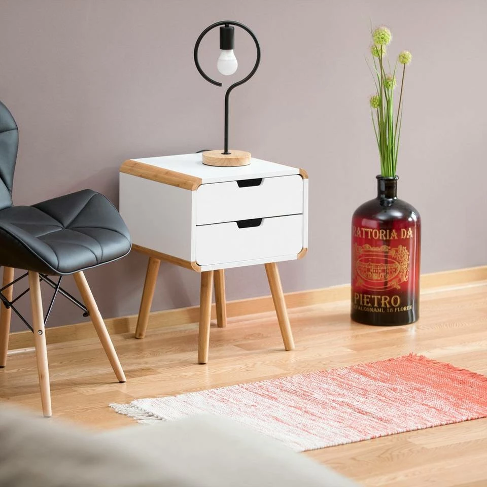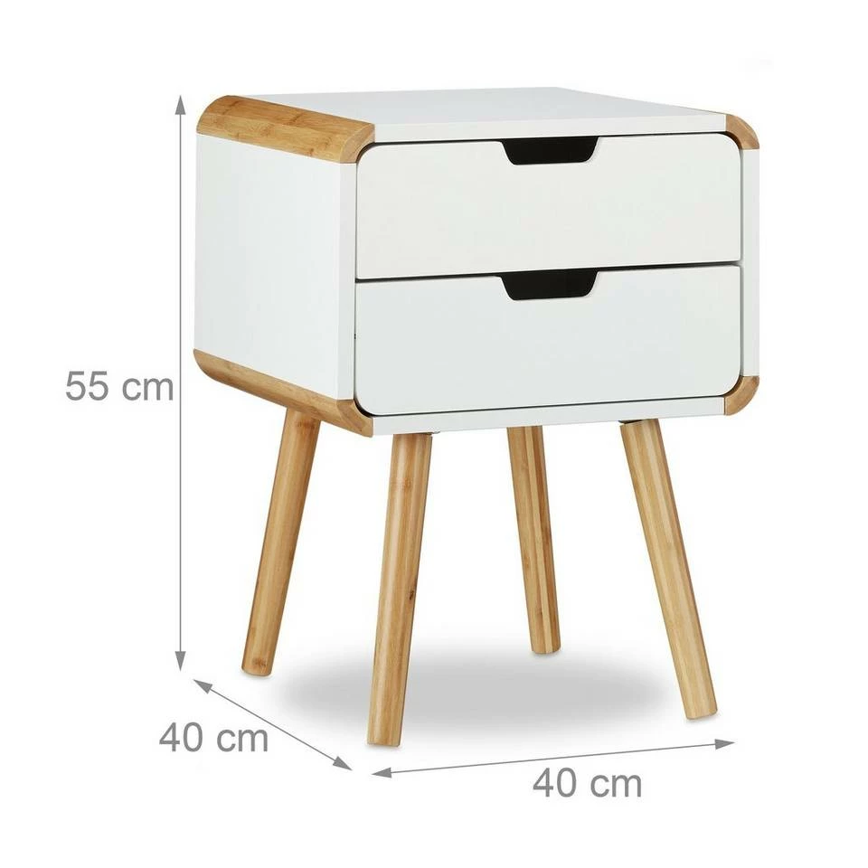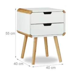 Nachttisch 2 Schubladen – Im nordischen Retro-Look Der Nachttisch mit 2 Schubladen weiß durch seinen coolen Retro-Look zu überzeugen. Der Mix aus weißer Ablage und naturfarbenen Elementen erinnert an skandinavische Möbel und verleiht dem Interieur einen hellen und freundlichen Anstrich. Die breite Ablage bietet im Schlafzimmer Platz für Bücher, Zeitschriften, einen Wecker und vieles mehr. In den zwei Schubladen ist Platz für allerlei Accessoires. Aber auch als Beistelltisch im Flur oder Wohnzimmer macht der Tisch eine gute Figur.