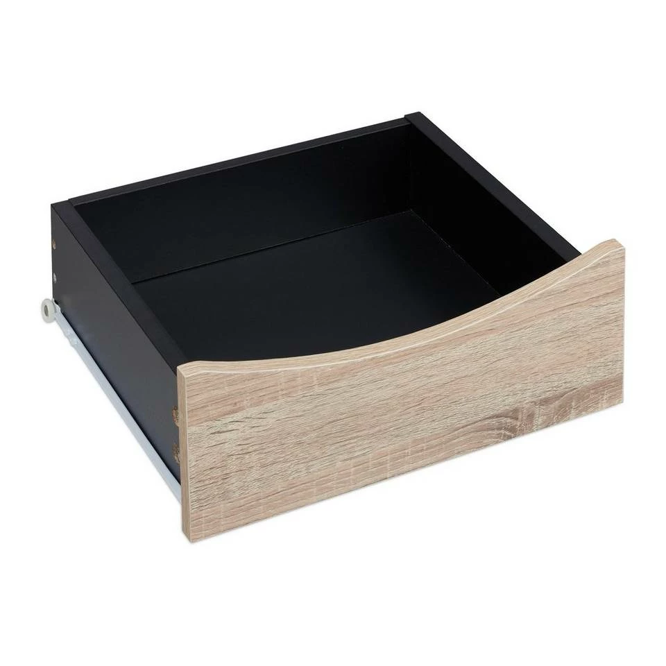 Nachtschrank im rustikalen Design Vor dem Schlafen gehen sollte eine gute Bettlektüre nicht fehlen. Mit einem kleinen Nachttisch neben Ihrem Bett haben Sie diese immer griffbereit und auch genügend Platz, um eine Leseleuchte gut zu platzieren. In der Schublade können Sie private Utensilien verstauen. Die untere Ablage bietet auch zusätzlichen Stauraum. Das schwarze Nachtkästchen mit der Holzoptik-Front überzeugt optisch auf ganzer Linie. Die metallenen Beine geben dem Tisch einen rustikalen Touch.