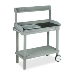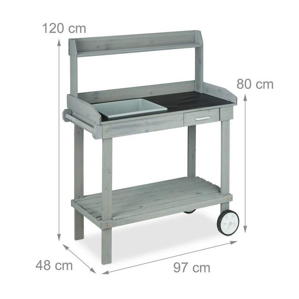 Fahrbarer Gartenarbeitstisch mit Wanne Deine grünen Schätze kannst Du dank des praktischen Gärtnertischs künftig bequem im Stehen umtopfen. Rücken- & Kniebeschwerden nach der Gartenarbeit gehören damit der Vergangenheit an. Für ein komfortables Arbeiten ist die Gartenwerkbank mit einer praktischen Arbeitsfläche & einer entnehmbaren Wanne für Erde ausgestattet. Darüber hinaus bietet sie großzügigen Stauraum für Töpfe, Werkzeuge & andere Utensilien. Bei Bedarf lässt sich die Pflanzbank dank der 2 Rollen bequem verschieben.