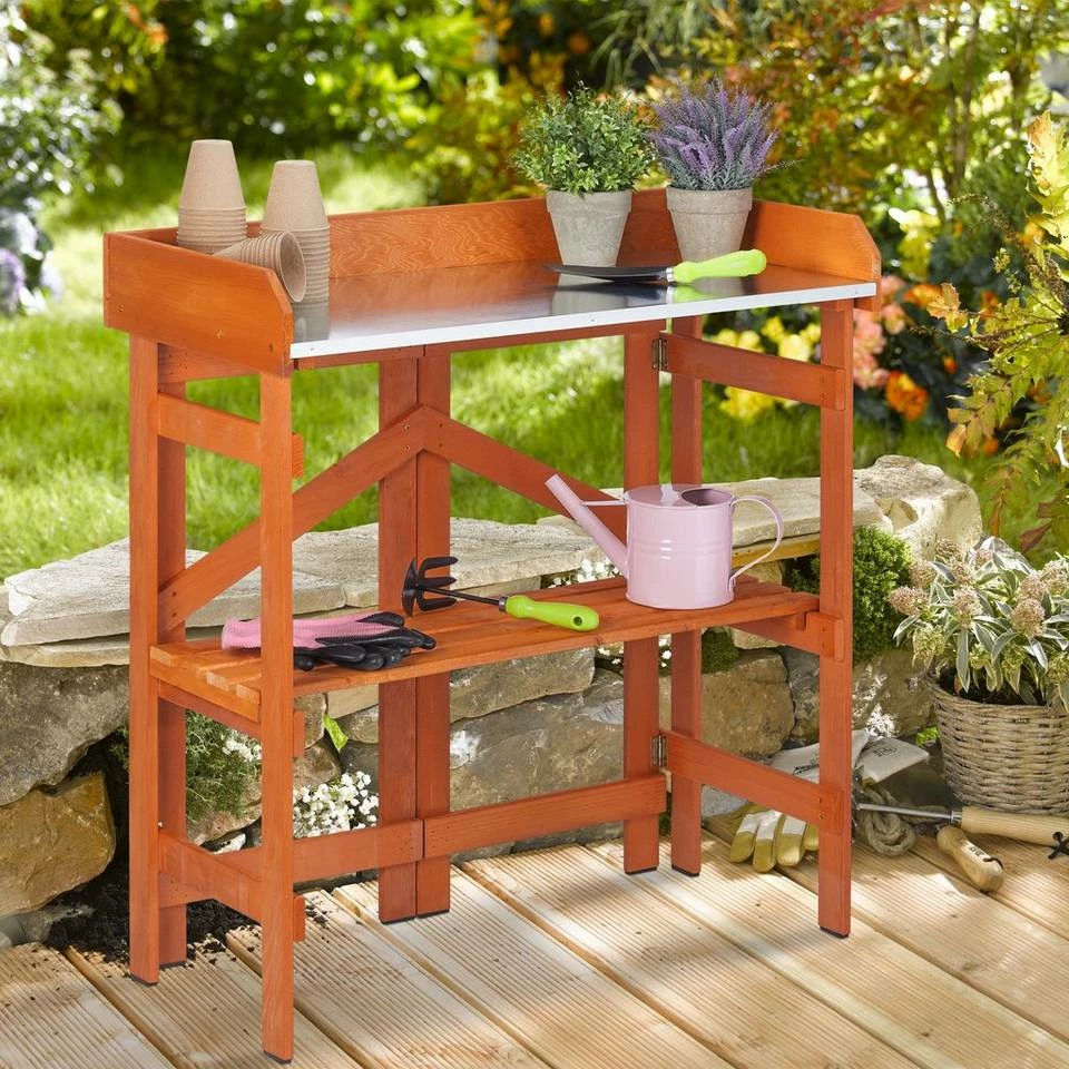 Wetterfester Pflanzentisch mit Ablage Nutzen Sie den Arbeitstisch im Garten, auf der Terrasse oder im Gewächshaus, um Pflanzen umzutopfen oder einzupflanzen. Dank der optimalen Höhe, können Sie rücken- sowie knieschonend arbeiten. Die Gartenwerkbank wurde aus Holz gefertigt und besitzt eine Arbeitsplatte aus Metall. Bei Bedarf kann der Pflanzentisch auch zusammengeklappt und platzsparend verstaut werden. Dabei besticht der Gartenpflanztisch mit einem dekorativen Design, welches sich in jedem Ambiente gut einfügt.