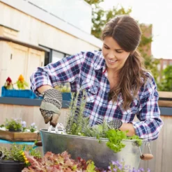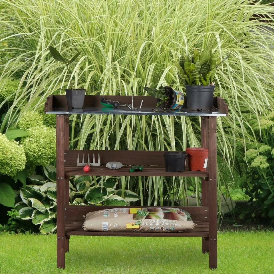 - Gartenarbeit: Die Arbeitsfläche des Gartentischs ist mit einer Metallplatte ausgestattet – Pflegeleicht