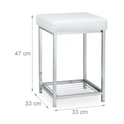 Eleganter Sitzhocker mit Polsterung Der kleine Sitzhocker verzaubert mit seinem eleganten und dennoch schlichten Design. Er überzeugt mit seinem verchromten Gestell und einer gepolsterten Sitzfläche mit Kunstlederbezug. Besonders praktisch ist die integrierte Ablagefläche, die Platz für Zeitschriften oder auch Ihren Lieblingsroman bietet. Nutzen Sie den Polsterhocker als kleine Sitzgelegenheit am Schminktisch, im Wohnzimmer oder Flur, als Badhocker sowie praktische Fußablage, wenn Sie Ihren Beinen ein bisschen Ruhe gönnen möchten.