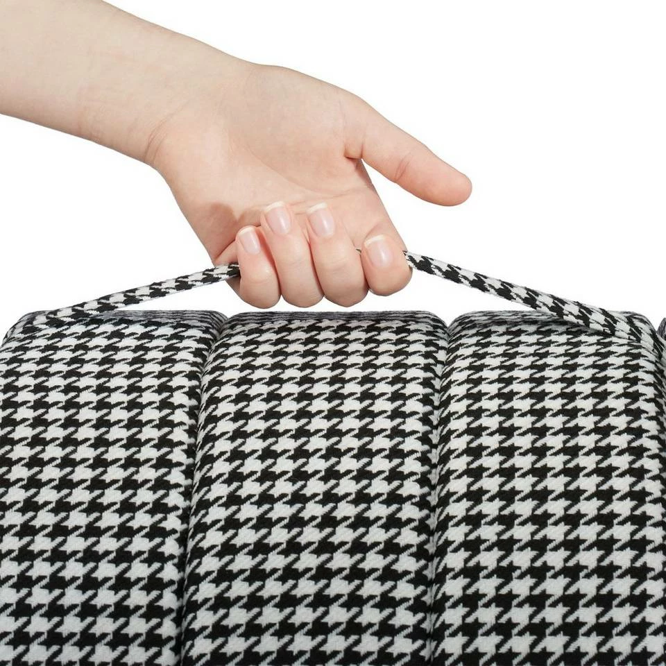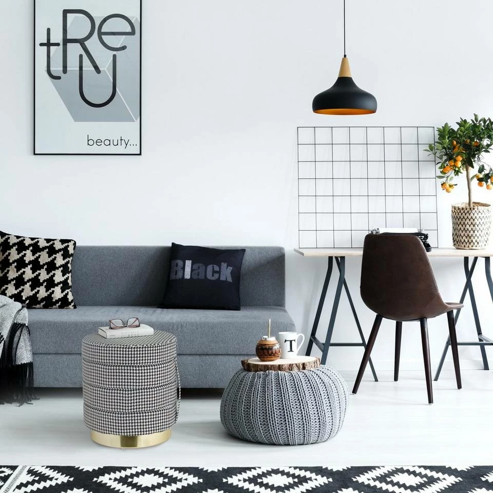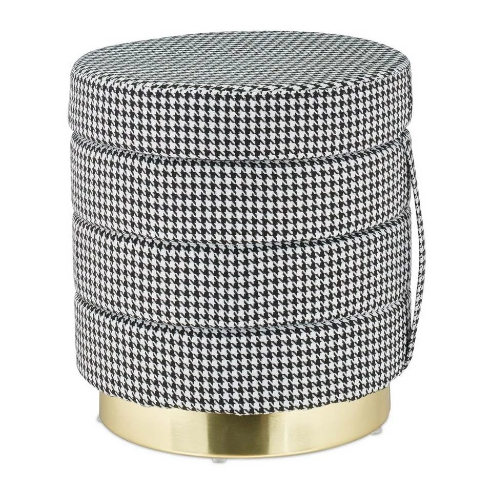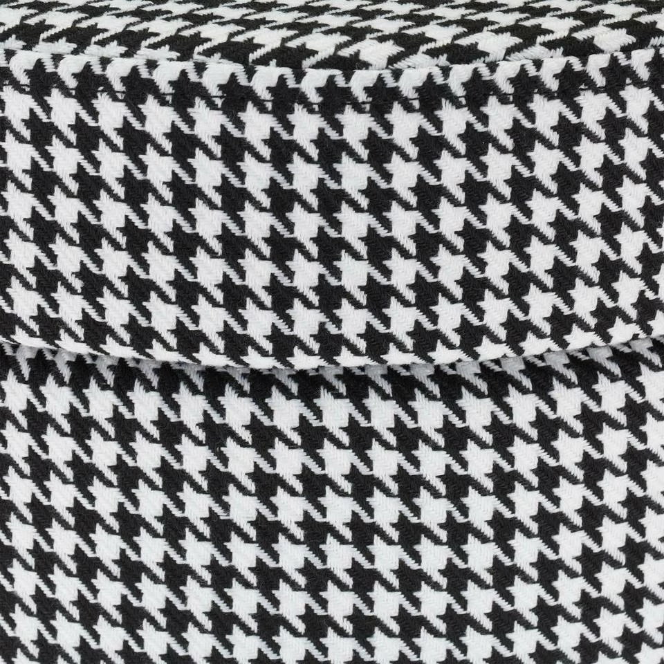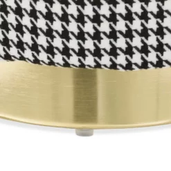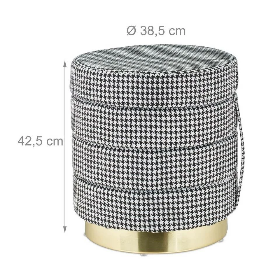 Beistellhocker mit Hahnentrittmuster Egal ob beim Fernsehen, im Büro oder beim Schminken – eine weitere Sitzmöglichkeit oder Fußablage sorgt immer für mehr Komfort. Mit diesem Dekohocker holen Sie sich nicht nur einen richtigen Eyecatcher mit Hahnentrittmuster zu Ihnen nach Hause, sondern auch eine bequeme Sitzmöglichkeit. Dank der Trageschlaufe am Rand des Polsterhockers können Sie den Hocker einfach dahin bringen, wo er gerade benötigt wird. Dank der Gummipuffer am goldenen Sockel des Poufhockers ist der Boden vor Kratzern geschützt.