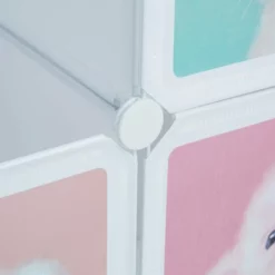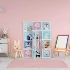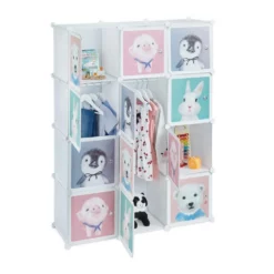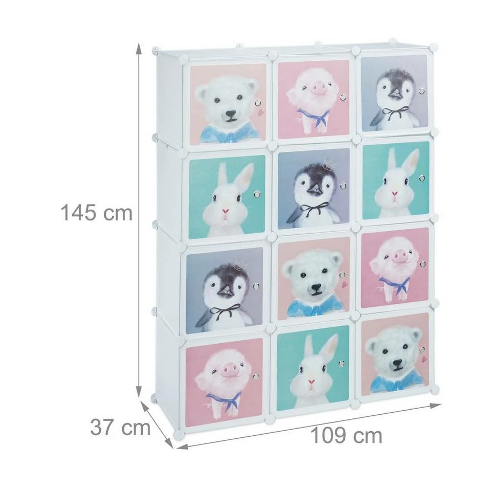 Kinderzimmer-Steckregal mit Tiermotiven Das große Kinderregal mit niedlichen Tier-Aufdrucken wird Kinder begeistern und schafft Ordnung. Der Kleiderschrank für das Kinderzimmer verfügt über 6 Würfel-Fächer und 2 hohe Fächer mit Kleiderstangen. Die Türen des weißen Schranks zeigen verschiedene Tiere, darunter Pinguin, Ferkel, Eisbär und Kaninchen. Die possierlichen Cartoonfiguren erfreuen Jungen wie Mädchen. Das Standregal basiert auf einem Stecksystem und kann nach Belieben zusammengesetzt werden. Tipp: Bauen Sie das Regalsystem bei Zimmertemperatur auf. Das gewährleistet, dass die Verbindungsstücke biegsam und flexibel bleiben.