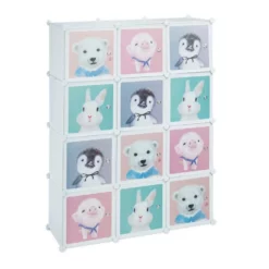 - Mit Tiermotiven: Steckregal mit bunten Türen – Pro Tür ein süßes Tier: Schwein, Pinguin, Bär o. Hase