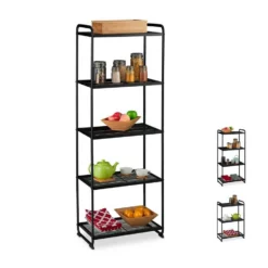 Vielseitiges Wohnregal in Schwarz Das universale Standregal kann beinahe jeden Zweck erfüllen und macht in jedem Raum des Hauses eine gute Figur. Ob für Utensilien in der Küche, für Vorräte in der Speisekammer, als offene Ablage im Flur oder für Bücher, Pflanzen und Deko im Wohnzimmer – das Metallregal ist ein echter Allrounder in Ihrem Haushalt. Mit dem schwarzen Wohnregal sorgen Sie für mehr Ordnung und Übersichtlichkeit. Zudem geht der Aufbau schnell vonstatten und schon ist das Regal verwendbar.