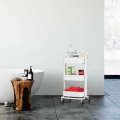 Vielseitiges Rollregal mit 3 Etagen Mit dem Rollwagen holen Sie sich einen praktischen Haushaltshelfer in Ihre 4 Wände. Dank 4 360° drehbaren Rollen lässt sich der Etagenwagen leicht von A nach B verschieben, 2 Bremsen ermöglichen einen sicheren Stand. Verwenden Sie den Küchenwagen als beweglichen Helfer zum Servieren von Speisen & Getränken oder als Beistellwagen für Bad, Büro oder Werkstatt. Auf 3 Ebenen bietet der Badwagen Platz für Handtücher, Büroutensilien, Werkzeug und mehr. Das schlichte Design fügt sich überall gut ein.