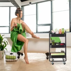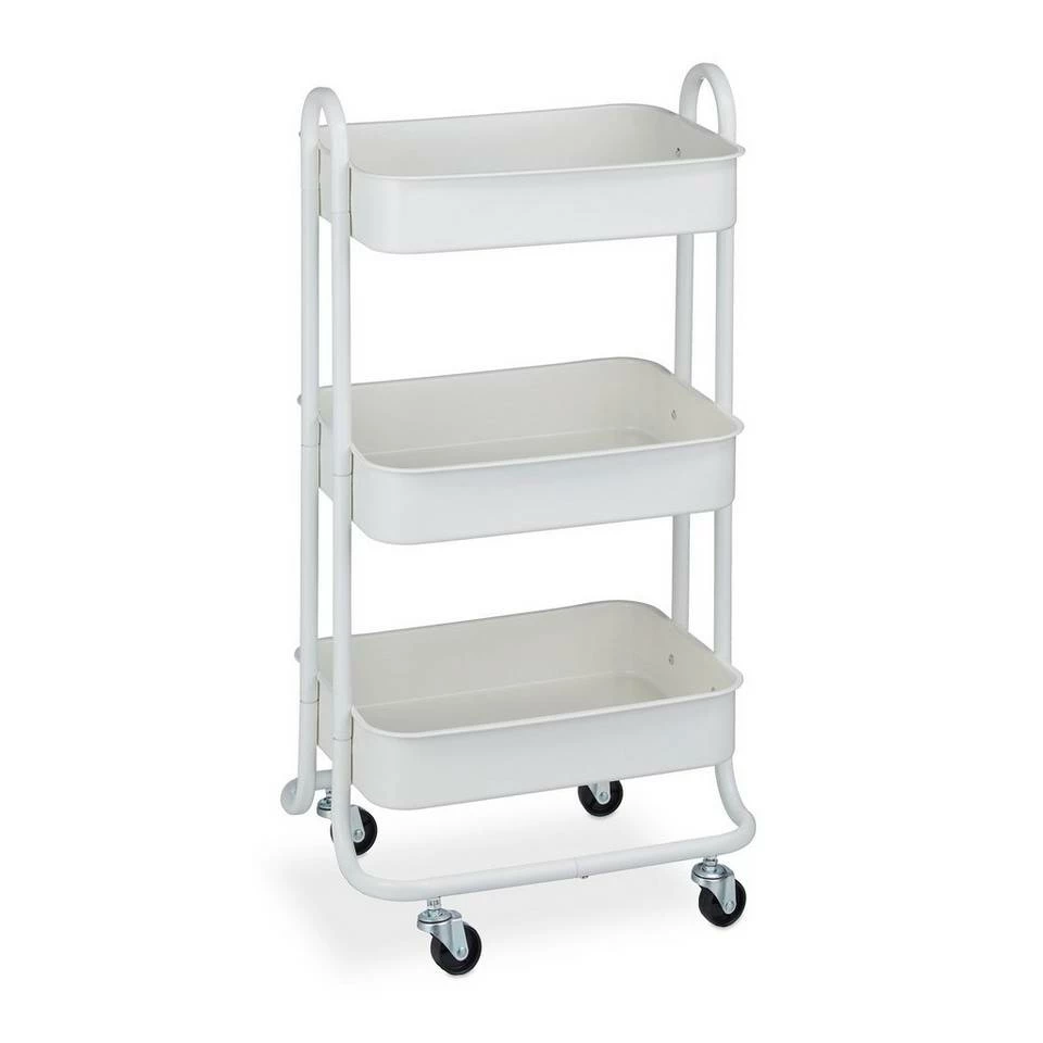 Vielseitiger Allzweckwagen für Küche, Bad und mehr Dieses Rollregal aus stabilem Metall ist im ganzen Haushalt eine praktische Hilfe. Der Etagenwagen macht als Badwagen für Handtücher, Pflegeprodukte und Putzmittel eine gute Figur, überzeugt aber auch als Servierwagen für Speisen, Getränke und Geschirr. Dabei benötigt der praktische Beistellwagen nur wenig Stellfläche und verfügt mit seinen 3 Ablagen dennoch über viel Stauraum. Mit den 360° drehbaren Rollen lässt sich der Haushaltswagen problemlos von A nach B schieben.