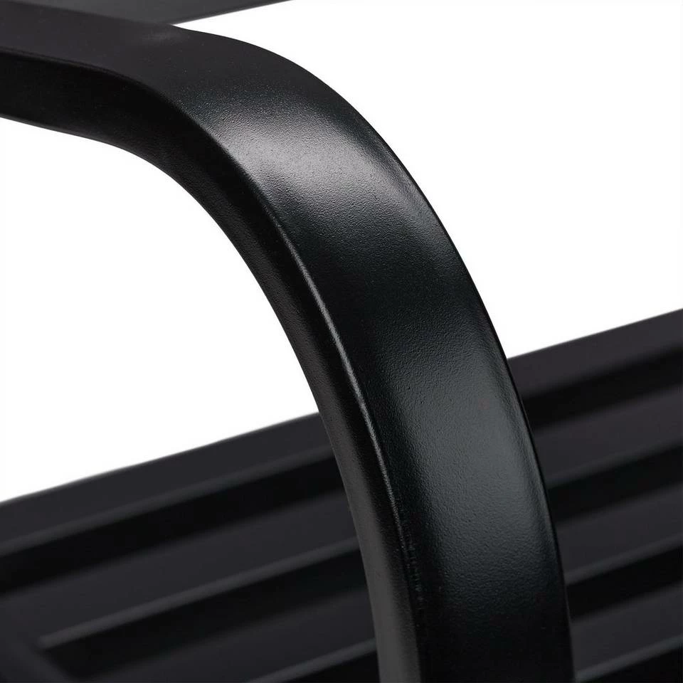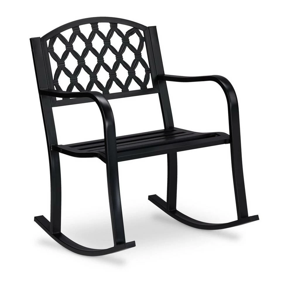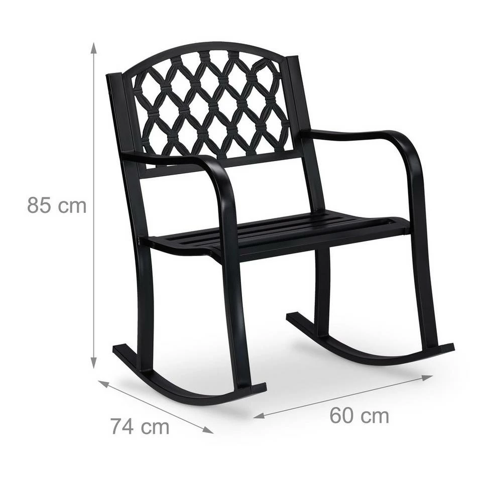 Vintage Schaukelstuhl für den Garten Mit dem schwarzen Schaukelstuhl aus Stahl und Gußeisen können Sie auch im Garten, auf der Terrasse oder dem Balkon das beruhigende Wippen genießen. Der robuste Schwingstuhl verfügt über einen breiten Sitz mit Armlehnen. Die Rückenlehne ist kunstvoll verziert und mutet antik an. Das belastbare Gartenmöbel trägt bis zu 100 kg und erfreut Groß und Klein. Die geschwungenen Kufen ermöglichen ein sanftes Schaukeln – ideal für Jung und Alt.