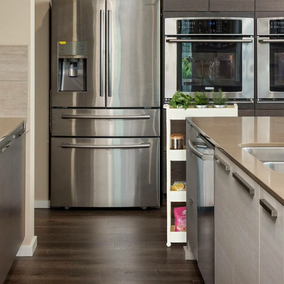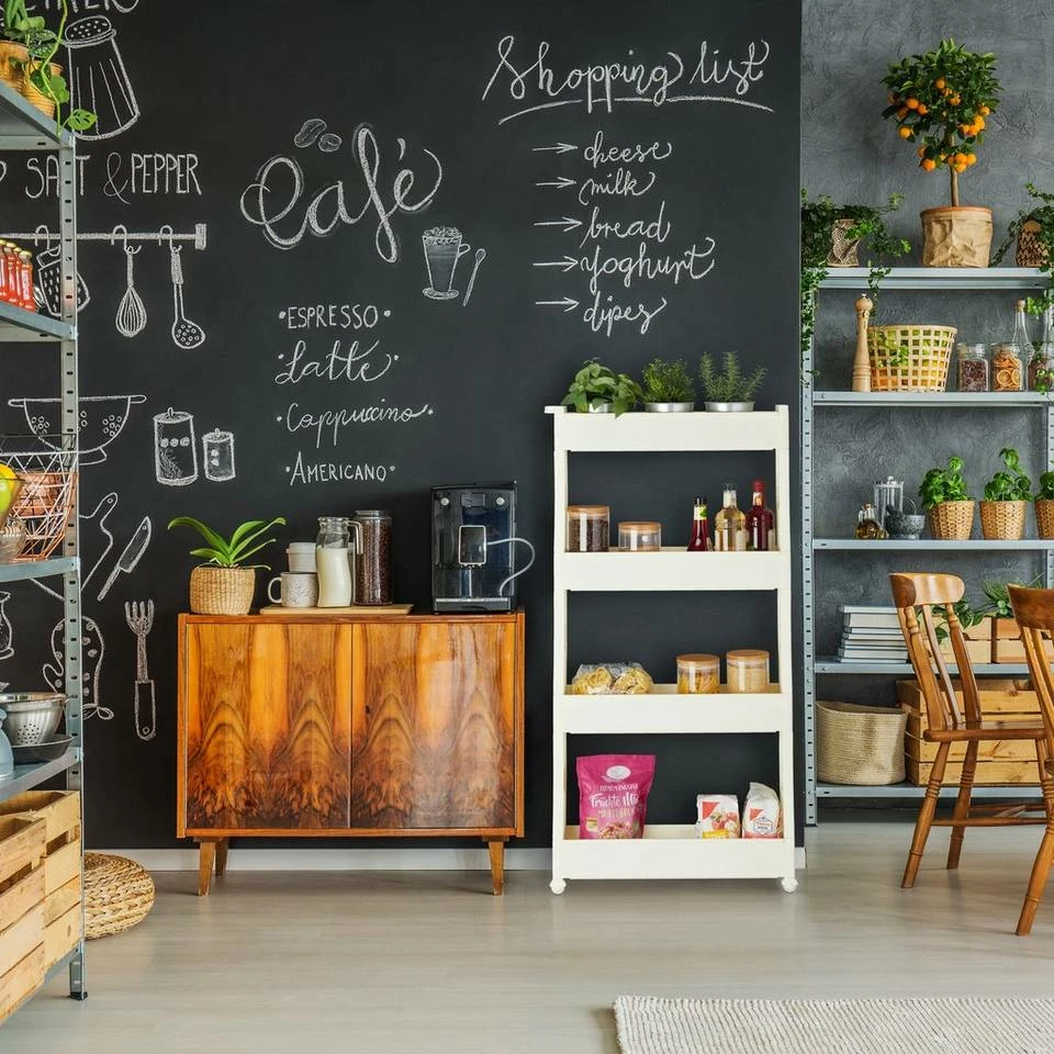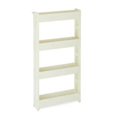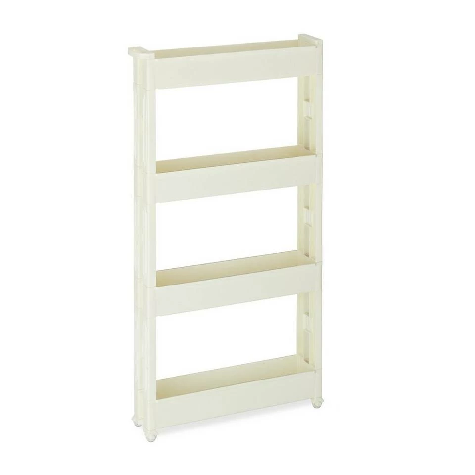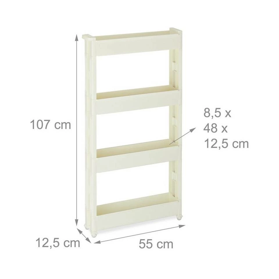 Rollwagen für Küche & Badezimmer Gerade in kleinen Wohnungen oder Räumen ist es häufig nötig, allen verfügbaren Platz auszunutzen. Das schmale Küchenregal passt dabei auch in kleinste Ecken, neben den Kühlschrank, die Waschmaschine oder ähnliches. Nutzen Sie die 4 breiten Ablagen für Ihre Lebensmittelvorräte, Reinigungsutensilien oder Badzubehör. Dank des Stecksystems ist der Aufbau des Abstellregals im Handumdrehen erledigt und das rollbare Nischenregal ist fertig für den Einsatz.