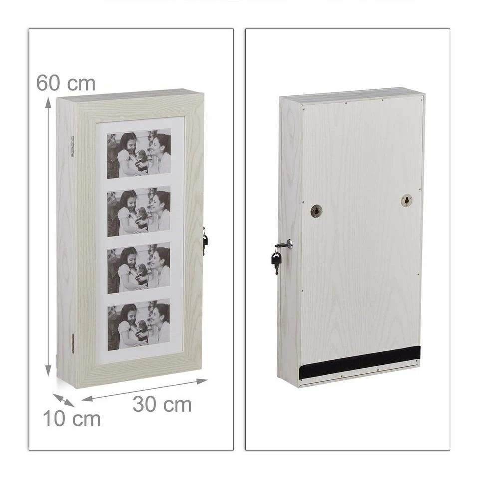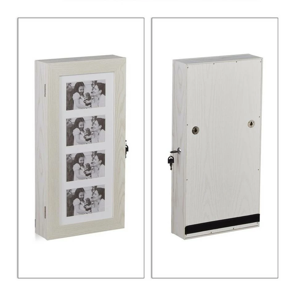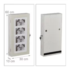 Schlichtes Schmuckregal mit Schlüssel Dieser schicke Schmuckschrank ist ideal für die Aufbewahrung Ihrer Ohrringe, Ketten und Ringe. Vom außen wirkt der Wandschrank wie ein moderner Bilderrahmen für 4 Fotos, doch öffnen Sie die Tür, kommen Ihre Schmuckstücke zum Vorschein. Idealerweise lässt sich die Tür fest verschließen, sodass Ihr Schmuck sicher ist vor Kindern und neugierigen Blicken. Das Schmuckschränkchen wird an der Wand montiert: mit Dübeln, Schrauben und einem Klettstreifen, der den Schmuckorganizer zusätzlich festigt.