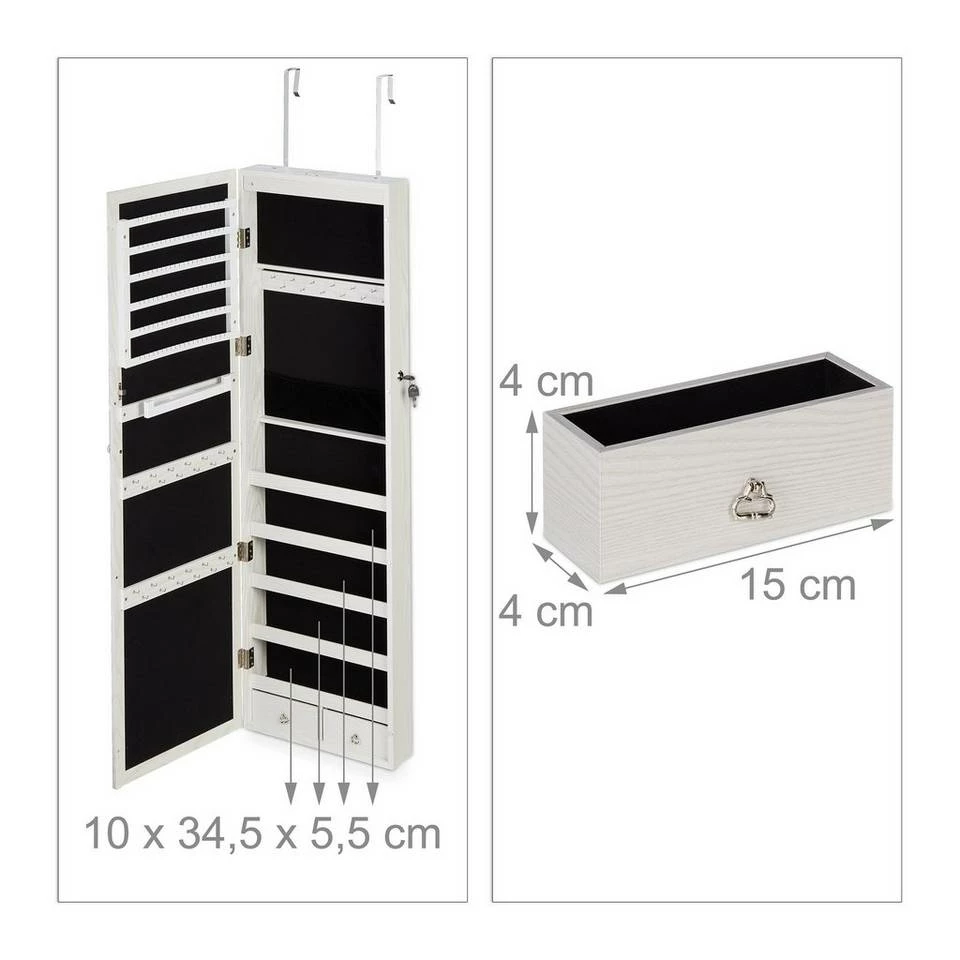 XXL Schminkschrank zur Tür- oder Wandmontage Wenn Sie Schmuck lieben, dann ist dieser Schmuckhalter die richtige Wahl. Das große Schnmuckregal bietet viel Platz für Halsketten, Ohrringe- und stecker, Ringe und Armbänder. In den Fächern und Schubladen können zusätzlich Kosmetikartikel und Parfums gelagert werden. Der Wandschmuckschrank verfügt innen über LED Beleuchtung, sodass Ihre Schmuckstücke in schönem Glanz erstrahlen. Dank Magnetmechanismus schließt der Parfümschrank sicher und kann zusätzlich auch abgeschlossen werden.