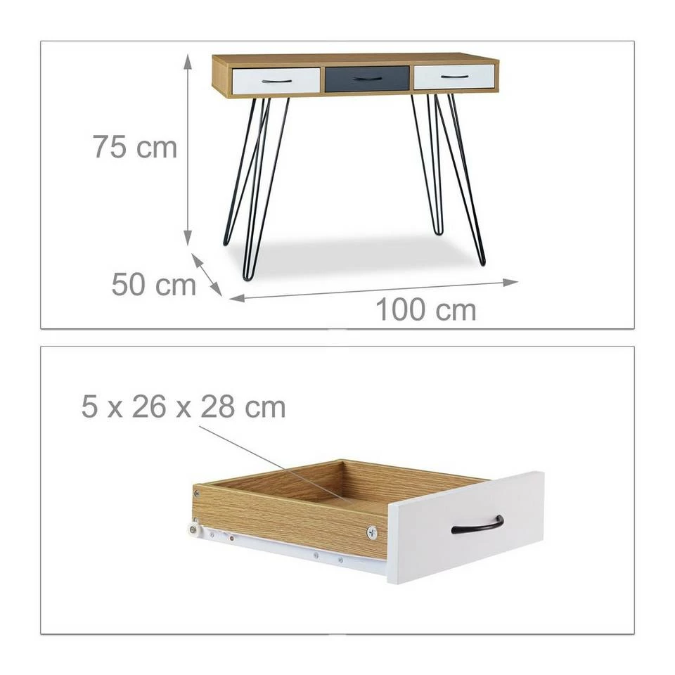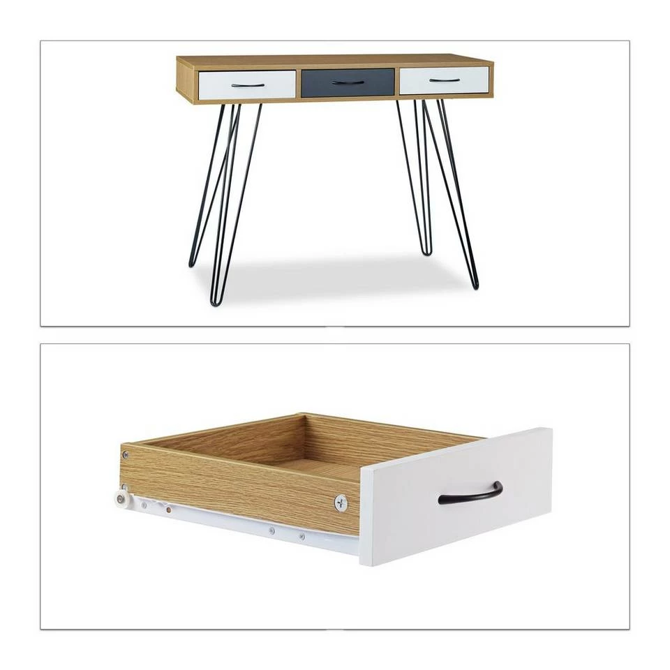 Designer Schreibtisch mit 3 Schubladen Der moderne Schreibtisch in stylischer Farbkombination punktet neben seinem schicken Erscheinungsbild auch dadurch, dass er jede Menge Stauraum für Büroartikel bietet. In den grauen und weißen Schubfächern liegen Dokumente, Schreibwaren und Sonstiges immer griffbereit und sind ordentlich aufbewahrt. Die breite Arbeitsfläche in hellbrauner Holzoptik passt optisch gut zu den stabilen Metallbeinen und ergibt so einen Bürotisch, der sich prima in die verschiedensten Einrichtungsstile einfügt.