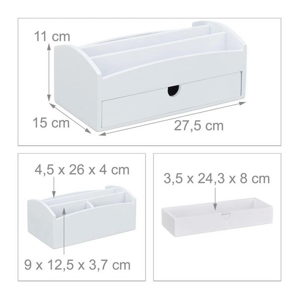 Büro Organizer für mehr Übersichtlichkeit Sorgen Sie für Ordnung und Übersichtlichkeit am Schreibtisch mit diesem Tischorganizer. In den 4 Fächern lassen sich verschiedene Büroutensilien wie Briefe, Stifte, Lineale, Scheren und vieles mehr verstauen. Das Schubfach an der Vorderseite bietet zusätzlichen Stauraum für Notizzettel, Büroklammern oder ähnliches. Der Schreibtisch Organizer aus Bambus ist nicht nur praktisch, sondern ebenso dekorativ. Das schlichte Design in Weiß fügt sich wunderbar im Büro, Badezimmer oder der Küche ein.