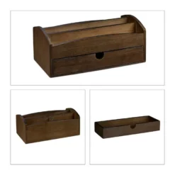 Moderner Tischorganizer aus Bambus Sie benötigen dringend einen Stift, aber können bei dem Chaos auf Ihrem Schreibtisch keinen finden? Diese Utensilienbox macht der ständigen Suche endlich ein Ende. Mit den 4 Fächern & der Schublade können all Ihre Utensilien ordentlich und übersichtlich verstaut werden. Platzieren Sie Stifte, Notizzettel, Briefe und vieles mehr griffbereit in den Ablagen. Der Schreibtischbutler überzeugt jedoch nicht nur mit seiner praktischen Anwendung, sondern auch mit seinem dekorativen Design in Dunkelbraun.