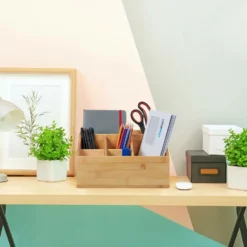 Bambusorganizer für den Arbeitsplatz Auf einem Schreibtisch sammeln sich schnell verschiedenste Stifte, Zettel und kleinere Utensilien an. Um Ordnung zu bewahren, ist dieser Büroorganizer perfekt geeignet: In 6 Fächern können Sie von Briefen im DIN A5-Format, über Notiz- und Klebezettel, Büroklammern und Lineale bis hin zu Ihren Stiften alles ordentlich aufbewahren. Damit schaffen Sie ein gutes Arbeitsklima, um fokussiert arbeiten zu können. Auch im Bad oder der Küche macht der Organizer eine gute Figur.