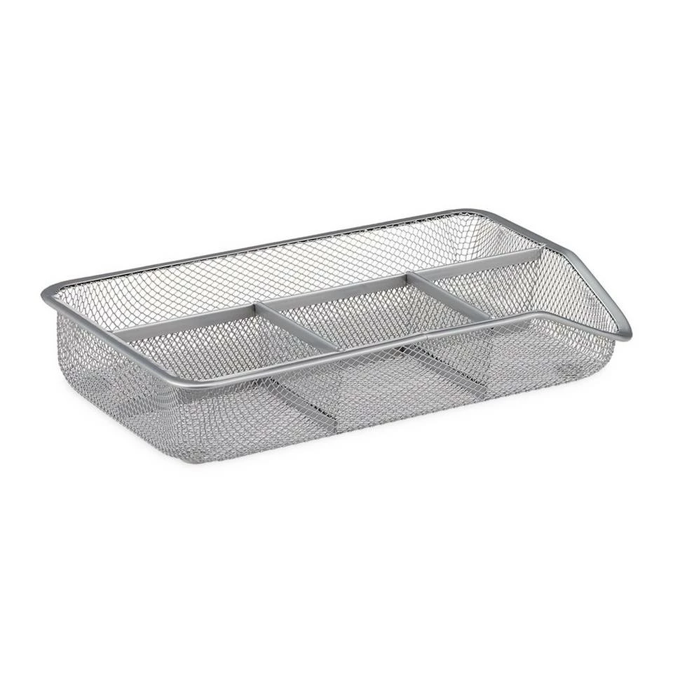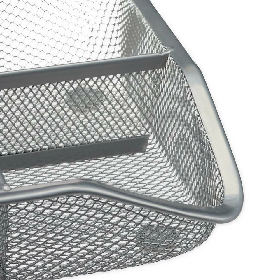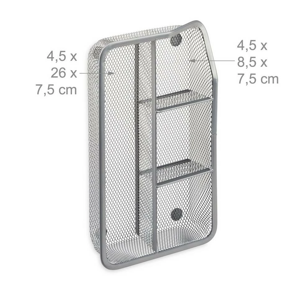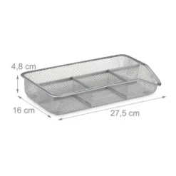 Schreibtischorganizer mit 4 Ablagen Metallgeflecht Der kompakte und flache Schreibtisch-Organizer bietet Platz für Stifte, Pinsel, Haftzettel, Büroklammern uvm. Dank der flachen Abmaße eignet sich der Schreibtisch-Organizer auch ideal als Einlagen für die Schreibtischschublade. So verschwinden Büromaterialien erstmal aus dem Blickfeld, bleiben aber gut sortiert, ohne dass sie in der Schublade verloren gehen. Ein Fach verfügt über eine abgerundete Ecke, darüber lassen sich z.B. Haftzettel ohne große Fummelei herausnehmen.