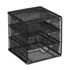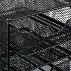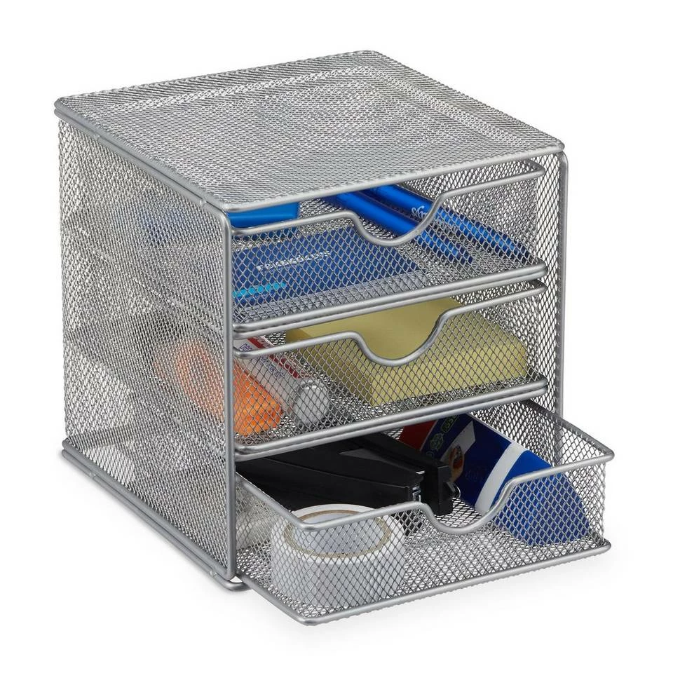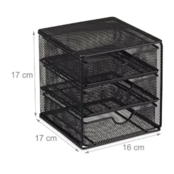 Schreibtischbutler für Bürobedarf Der quadratische Schreibtischorganizer macht sich mit seiner geradlinigen Mesh-Optik erstklassig auf Ihrem Schreibtisch im Arbeitszimmer oder Büro. Die Zeit des überall herumliegenden Büromaterials ist damit Geschichte. Ob Büroklammern, Radiergummis oder Blöcke mit Klebezetteln: Dank des Ordnungssystems ist alles an seinem Platz, sichtbar und jederzeit griffbereit. Die halbrunden Grifföffnungen erleichtern das Herausziehen der Schubladen, bei Bedarf auch komplett.