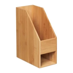 Stehordner aus Bambus für Ihren Arbeitsplatz Ein ordentlicher Arbeitsplatz trägt zum konzentrierten Arbeiten bei. Durch den Stehsammler können Sie A4-Dokumente, Kataloge und Briefe an einem Ort aufbewahren. Besonders praktisch ist die kleine Schublade mit Griffloch. Dort können Sie Büro-Utensilien wie Stifte, Lineal, Schere und mehr aufbewahren. Der optische Farb-Mix von natürlichen Bambustönen und weißem Schubfach überzeugt. Der moderne Zeitschriftensammler ist für Büro, dem heimischen Arbeitsplatz und Jugendzimmer bestens geeignet.