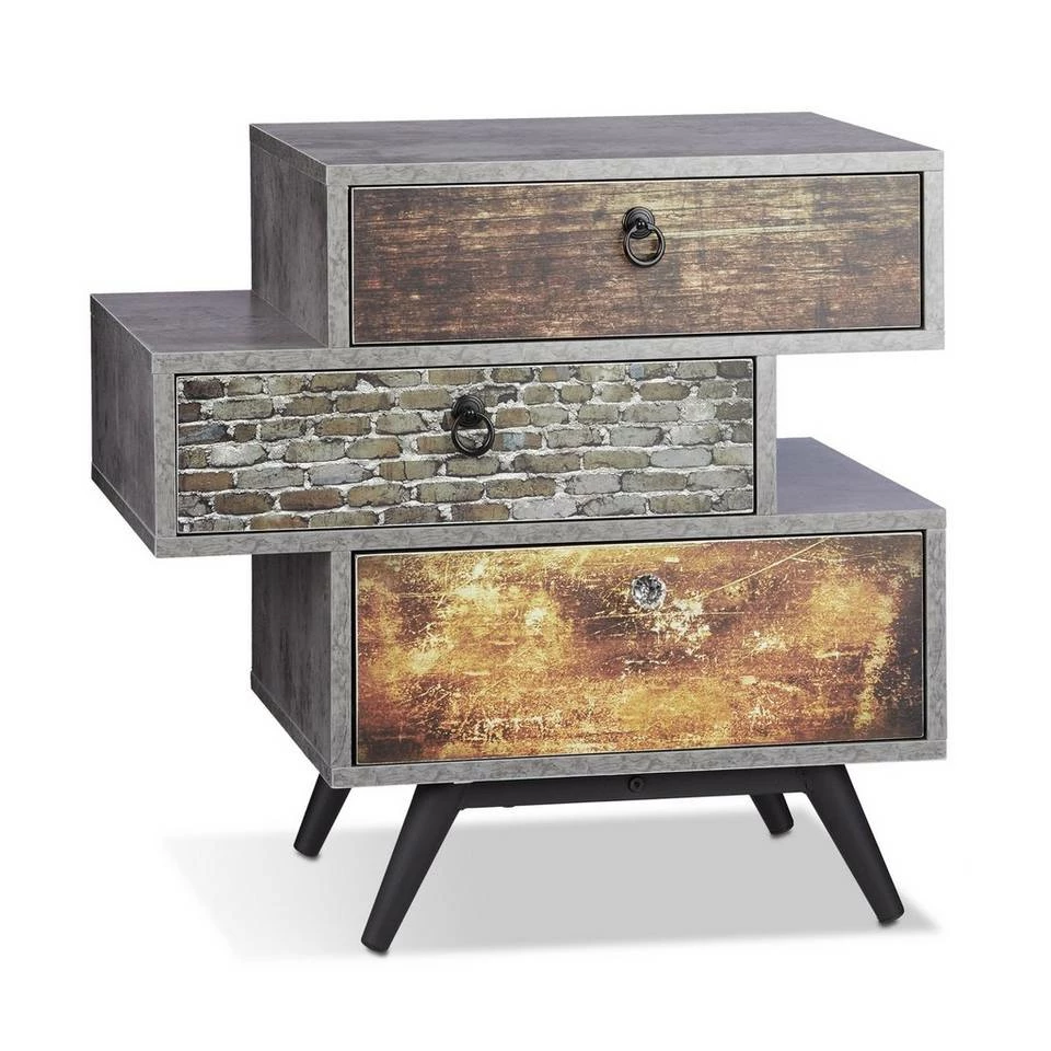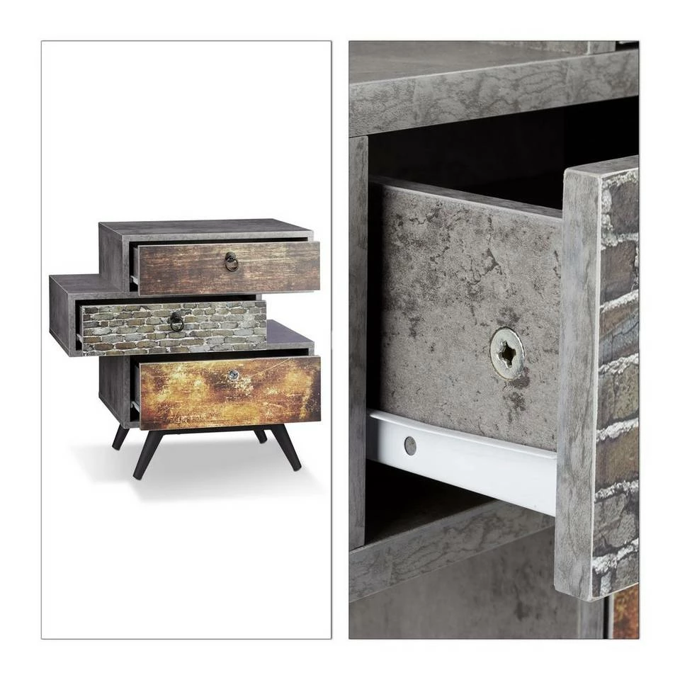 Vintage Kommode im effektvollen Design Für Freunde origineller Gestaltung ist die Vintage Kommode Stone ein echtes Muss. Die drei versetzt gestapelten Schubladen sind ein echter Hingucker und bieten mit dem Überhang zusätzliche Ablagefläche. Der Korpus ist in der beliebten Steinoptik gehalten. Die Fronten der Schubkästen setzen durch diverse Motive raue Akzente. Das Furnier erinnert an alte Steinwände, verwittertes Holz, rostiges Metall und unverputzten Beton und versprüht so – im Sinne des Industrial Style – den Charme alter Werksgebäude. Die Griffe aus Türklopfer und Diamant-förmigen Knauf verleihen dem Beistellschrank einen Hauch Shabby Chic.