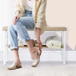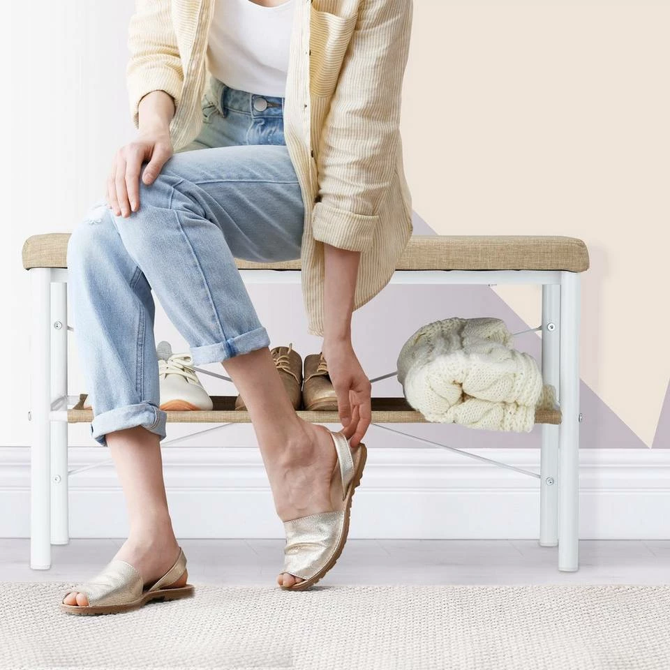 - Basics: Praktische Schuhbank aus weißem Eisen und beigem Stoff – Maße H x B x T: ca. 42 x 72 x 32