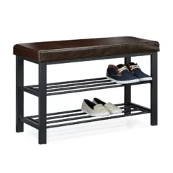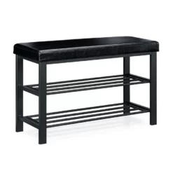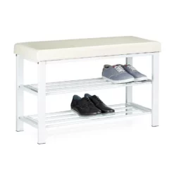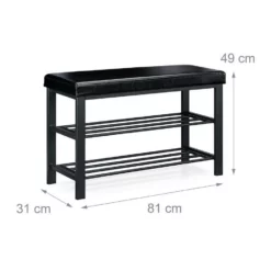 Schuhbank mit Polsterung Diese multifunktionale Schuhbank mit einem hochwertigen Polster aus Kunstleder bringt Ordnung in Ihren Flur. Die Schuhbank verbindet ein intelligentes Aufbewahrungssystem für Ihre Schuhe mit einer angenehmen Sitzmöglichkeit für mehrere Leute. Auf zwei Ablagen haben jeweils ca. 8 Schuhe Platz. Auf der Polsterung aus Kunstleder finden mehrere Personen bequem Platz. Der Aufbau gestaltet sich durch die beigelegten Materialen und die Aufbauanleitung einfach und kann von jedermann bewältigt werden. Wählen Sie aus den Farben Weiß, Schwarz und Braun. Sorgen Sie dafür, dass Ihre Gäste nie wieder über Ihre Schuhe stolpern.