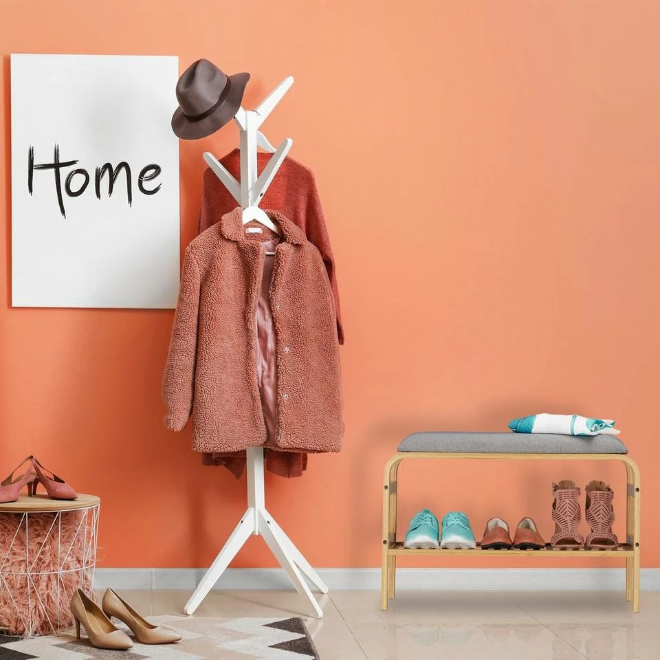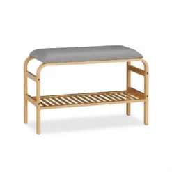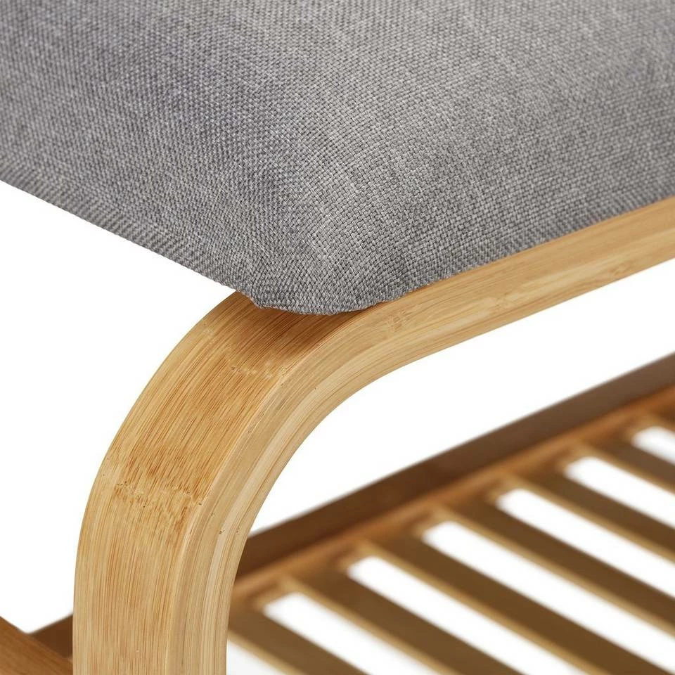 Schuhbank für die Garderobe Das schmale Schuhregal mit Sitzgelegenheit passt in jeden Eingangsbereich und erleichtert Ihnen so das An- und Ausziehen Ihrer Schuhe. Das bequeme Sitzpolster bietet Platz für 1 Person. Die Schuhablage fasst je Modell bis zu 6 Paar Schuhe. Das Schuhgestell ist aus Bambus gefertigt und besticht durch seine glatten Rundungen im warmen Holzton. Die Flurbank mit Aufbewahrungsmöglichkeit ist auch in anderen Zimmern wie Bad und Schlafzimmer ein wahrer Alltagshelfer.