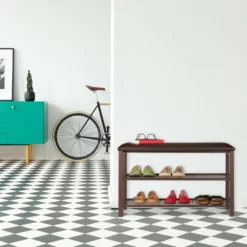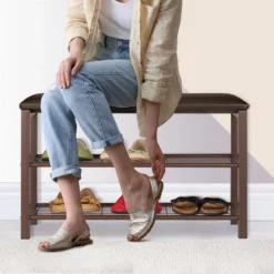 Schuhständer mit Sitzbank für bequemes Schuhanziehen Die Kombination aus Schuhregal und Sitzbank ist ein platzsparendes Raumwunder. Auf den 2 Ablageebenen der Schuhbank finden 6 bis 8 Ihrer Lieblingsschuhe Platz. Zusätzlich können Sie sich Ihre Schuhe bequem auf der gepolsterten Sitzfläche der Garderobenbank anziehen. Das schicke in Braun gehaltene Design sorgt dafür, dass sich der Schuhständer überall stilvoll einfügen kann. Die an den Füßen des Schuhgestells angebrachten Kunststoffschoner schützen vor Kratzern und Schrammen am Boden Ihres Flures.