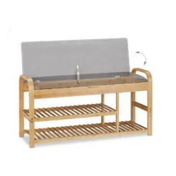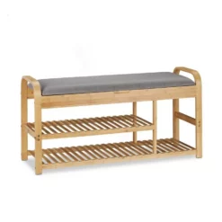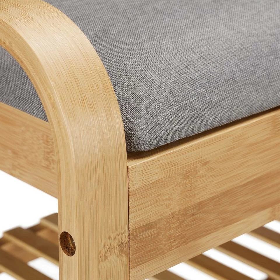 - Moderne Optik: Schuhsitzbank für den Flur aus natürlichem Bambus mit grauem Sitzkissen – Elegante Kombi