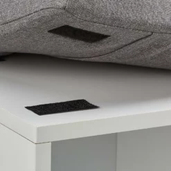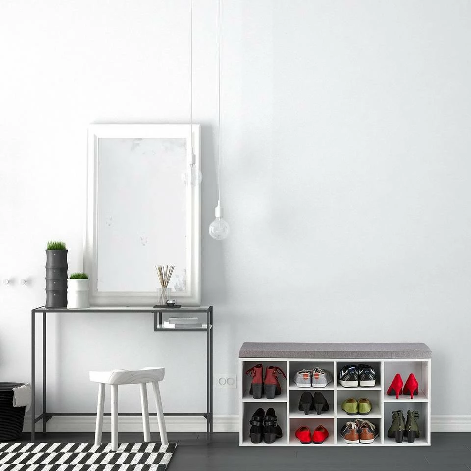 - Design: Moderne Schuhkommode in Weiß mit grauem Sitzkissen als Blickfang im Ankleidezimmer oder Flur